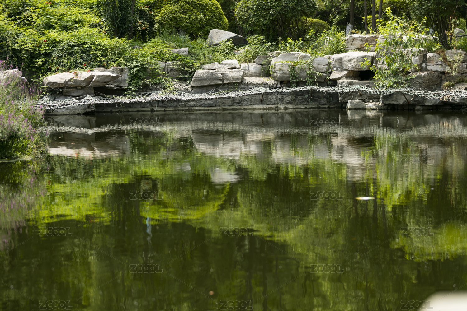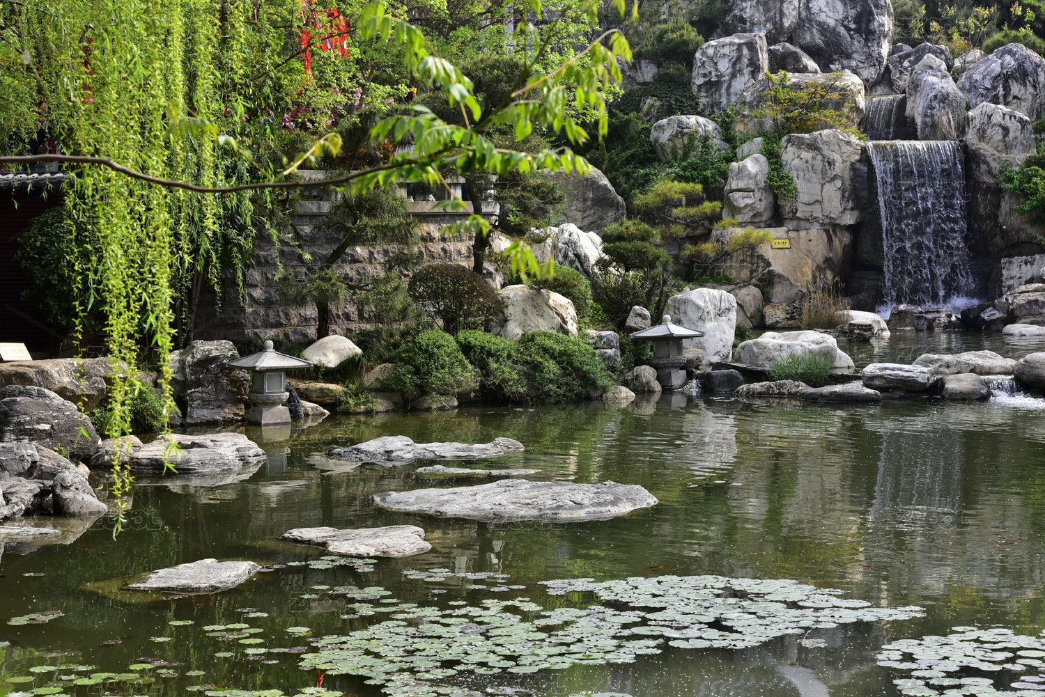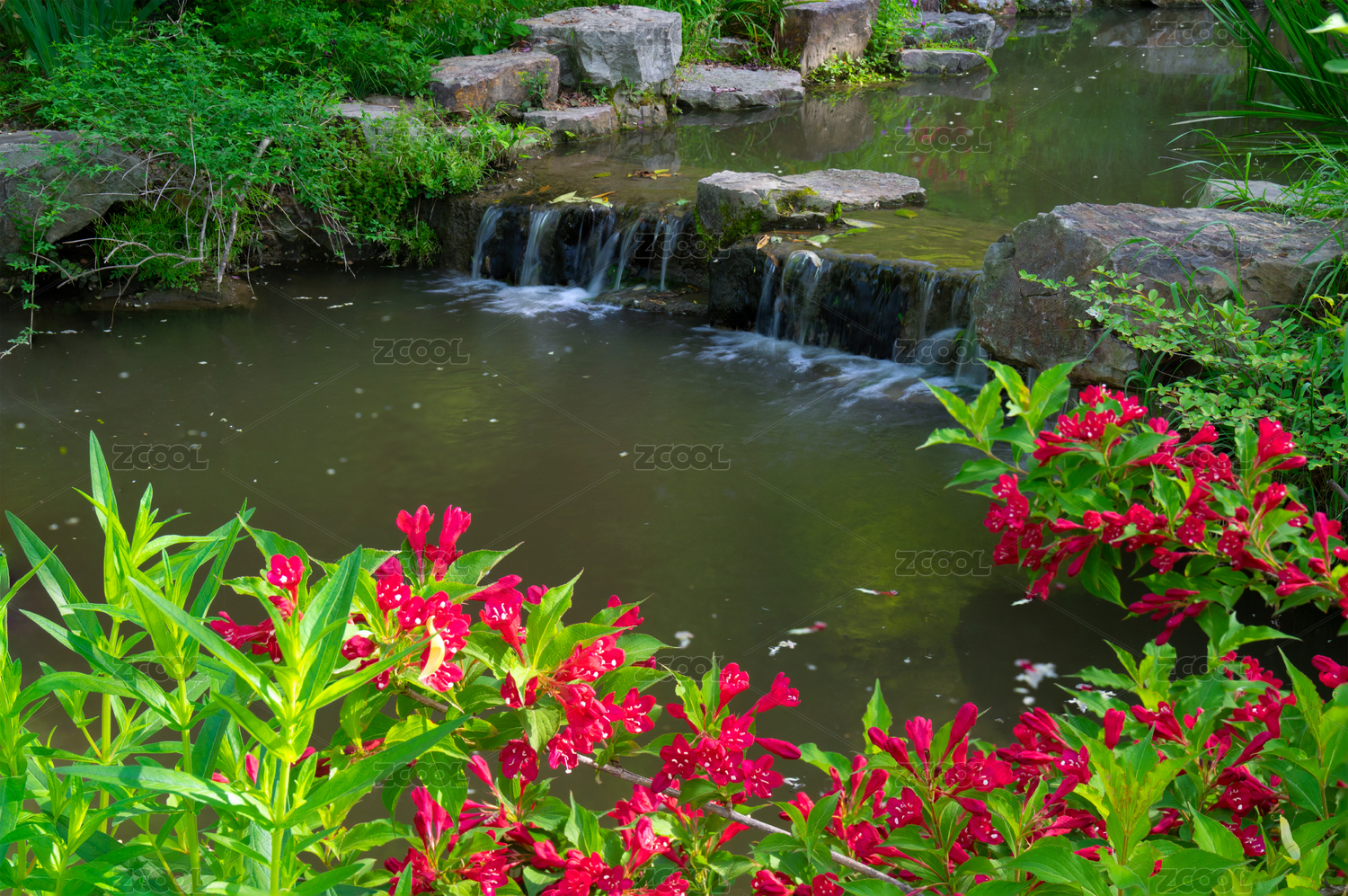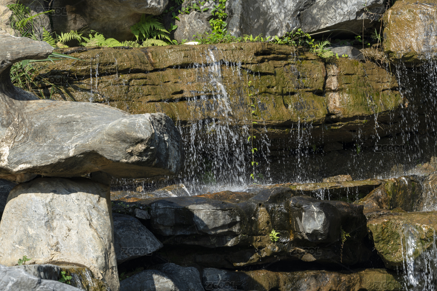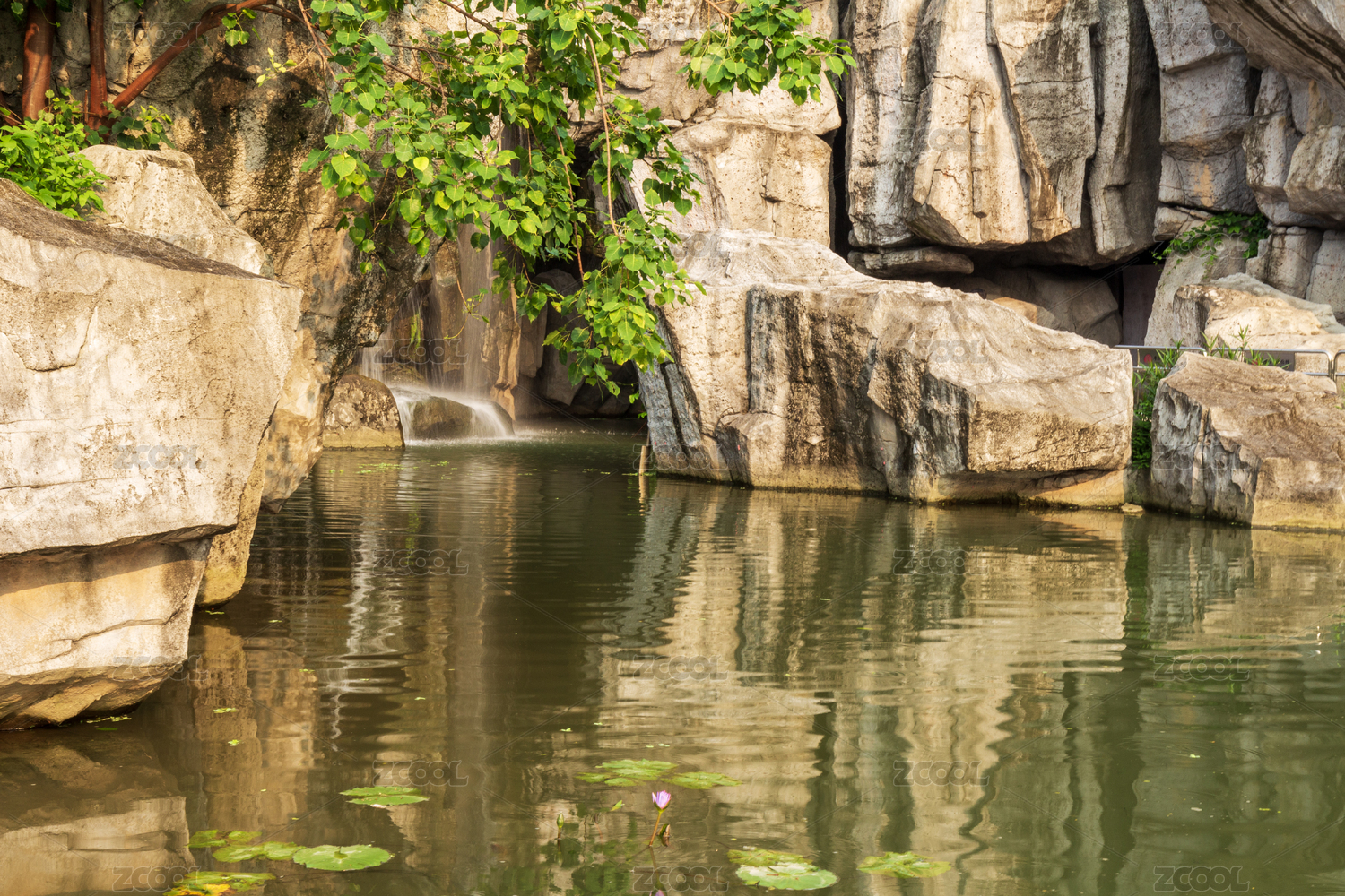 河南南阳卧龙岗文化园景区内奇石劲松瀑布