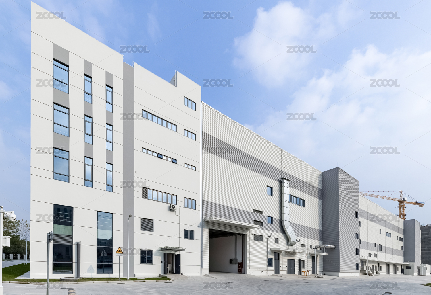 蓝天白云下两幢标准化厂房外观及中间的通道
