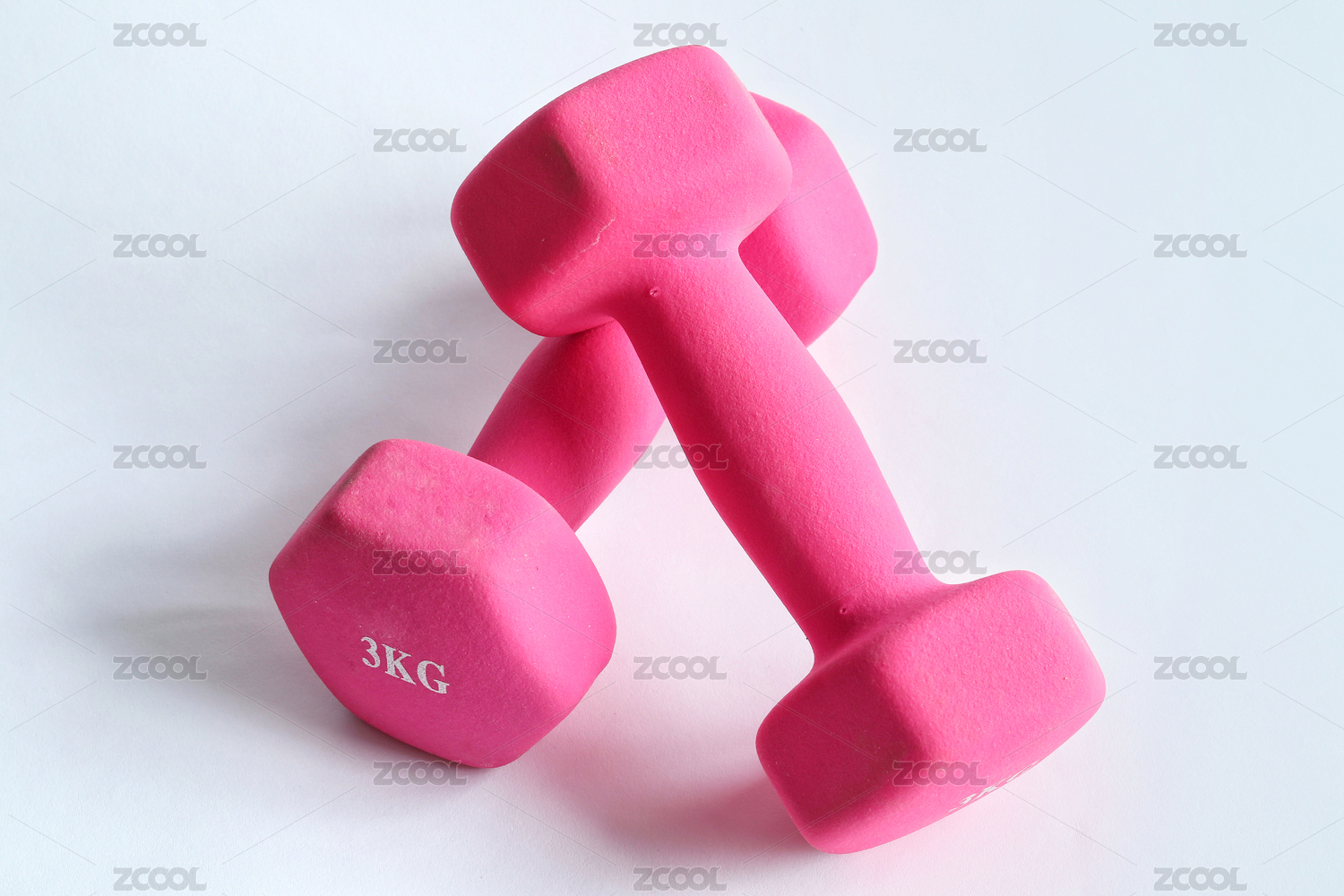 一对粉红色的哑铃放在白色桌面上