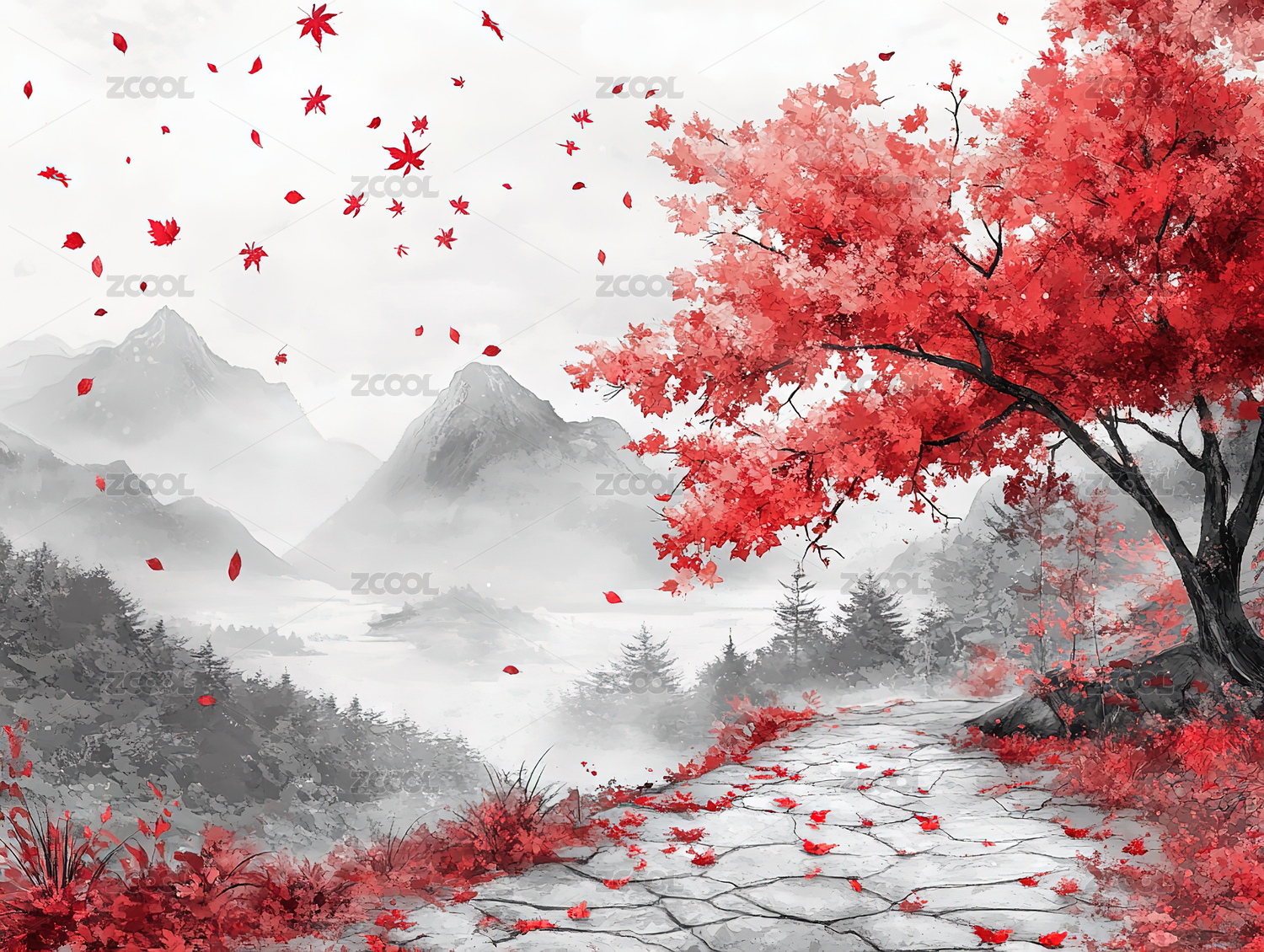 水墨山水红叶秋景