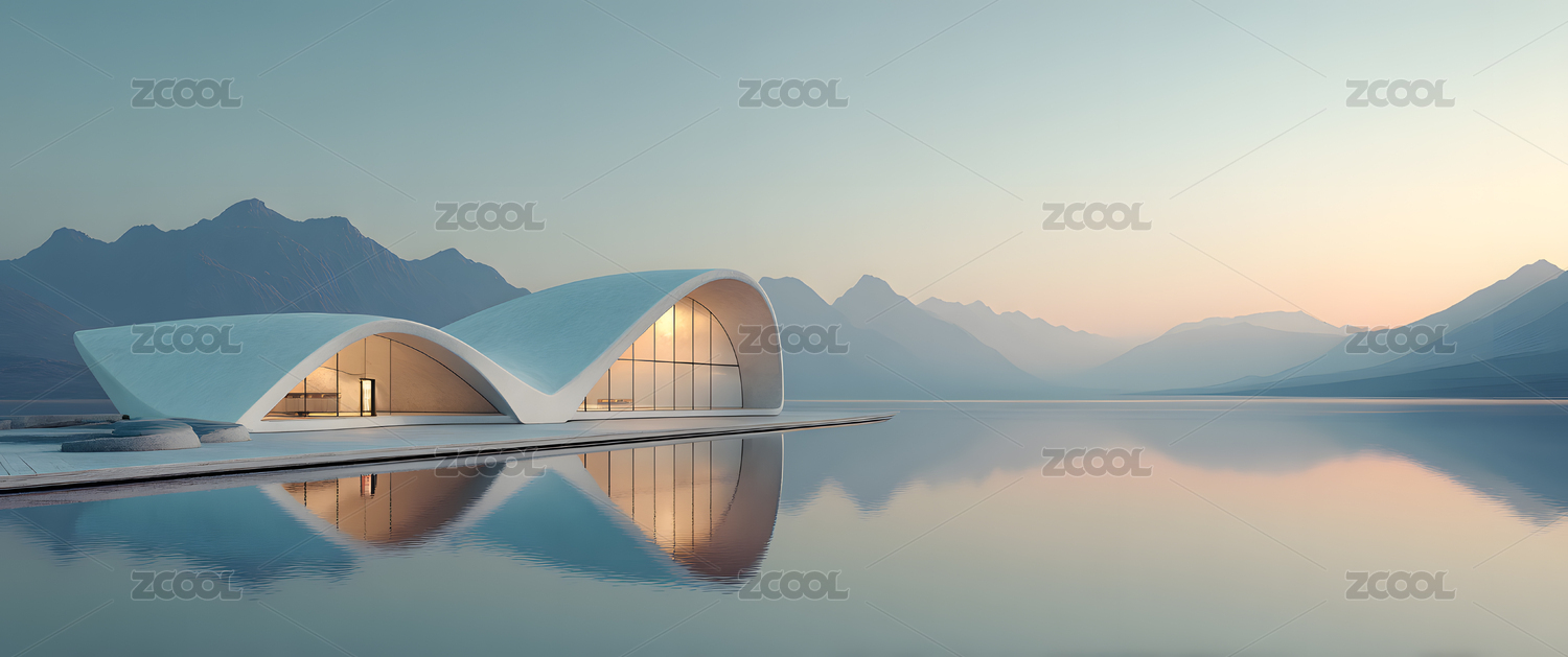 湖畔弧形建筑与远山相映