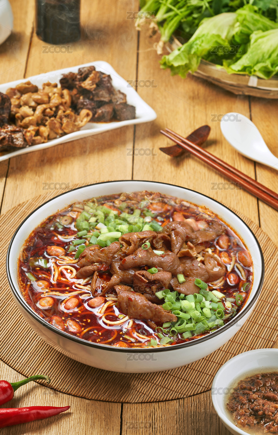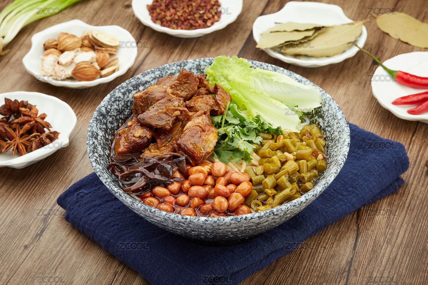 美味的广西柳州螺蛳粉,在木质的桌面背景