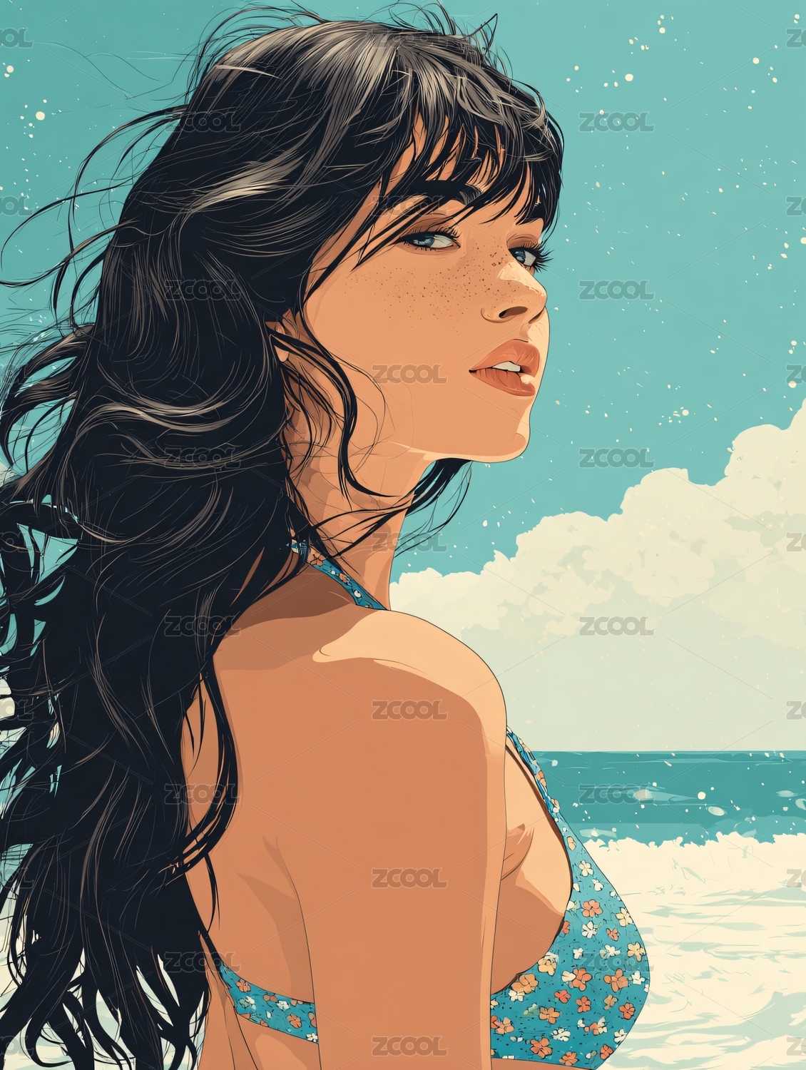 AIGC202401,明亮,蓝背景,泳衣,泳帽,黑头发,东方,女性,插画,绘画