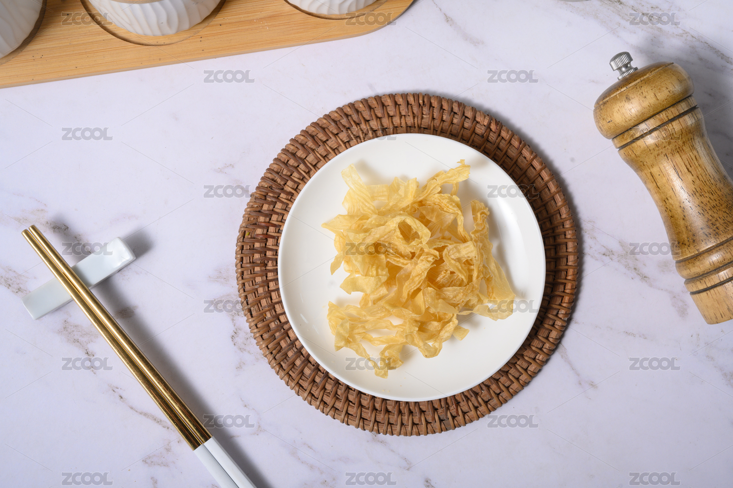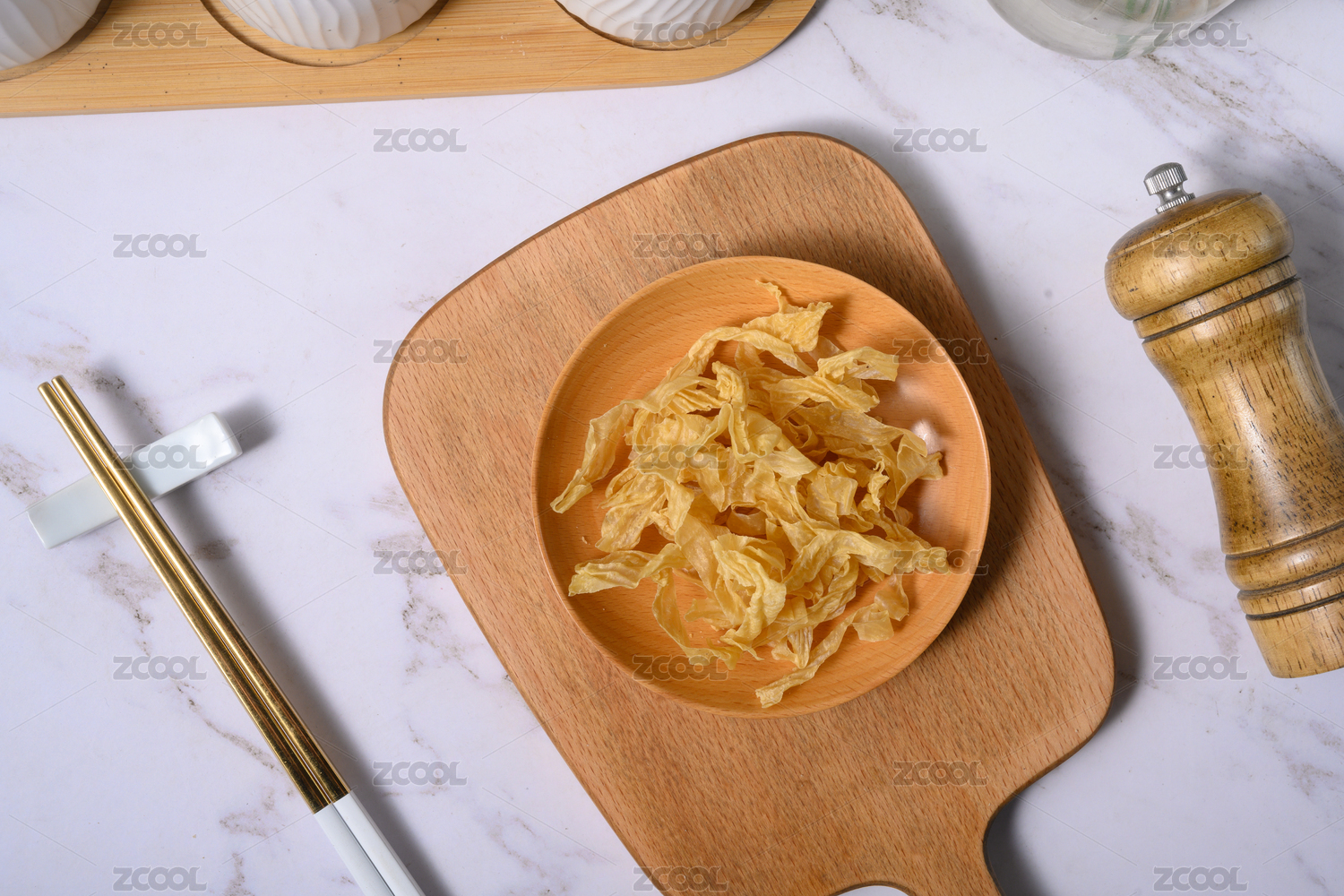 桌面上的盘子里的美味可口的泡发开的豆皮