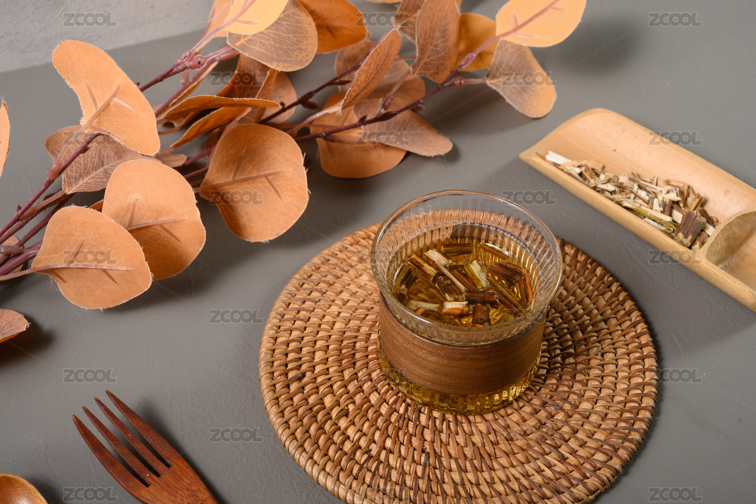 桌面上的杯子里的甘甜可口的胰岛果茶
