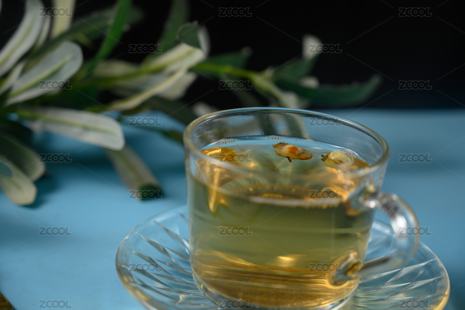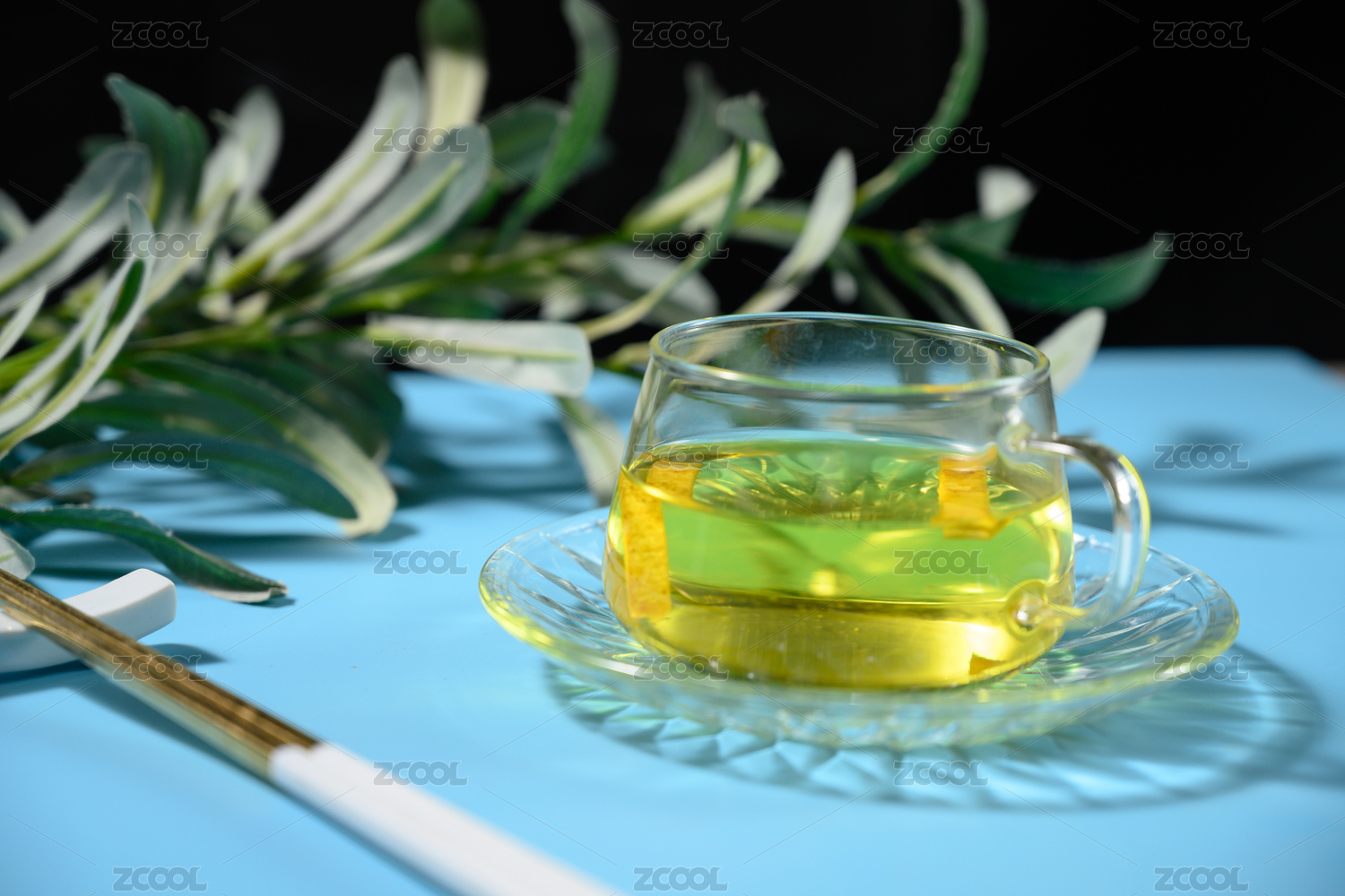 桌面上的杯子里的甘甜可口的马鞭草茶