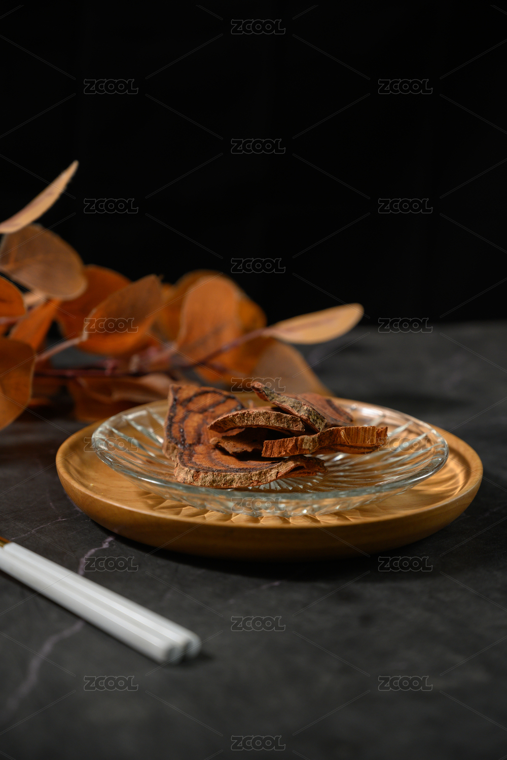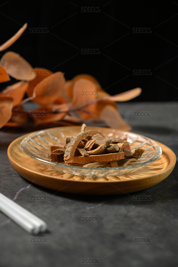 桌面上的盘子里的干爽的秦皮