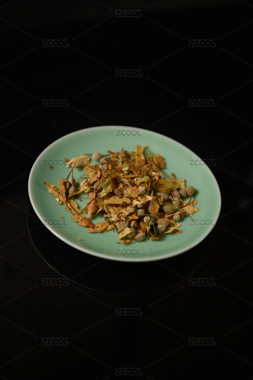 桌面上的盘子里的干爽的五花茶材料