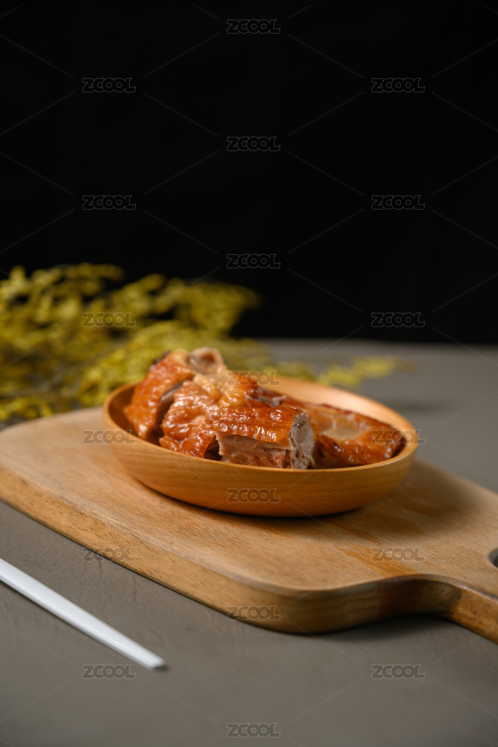 桌面上的盘子里的美味可口的北京烤鸭