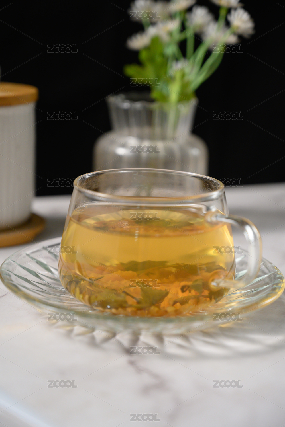 桌面上的杯子里的甘甜可口的金盏菊花茶