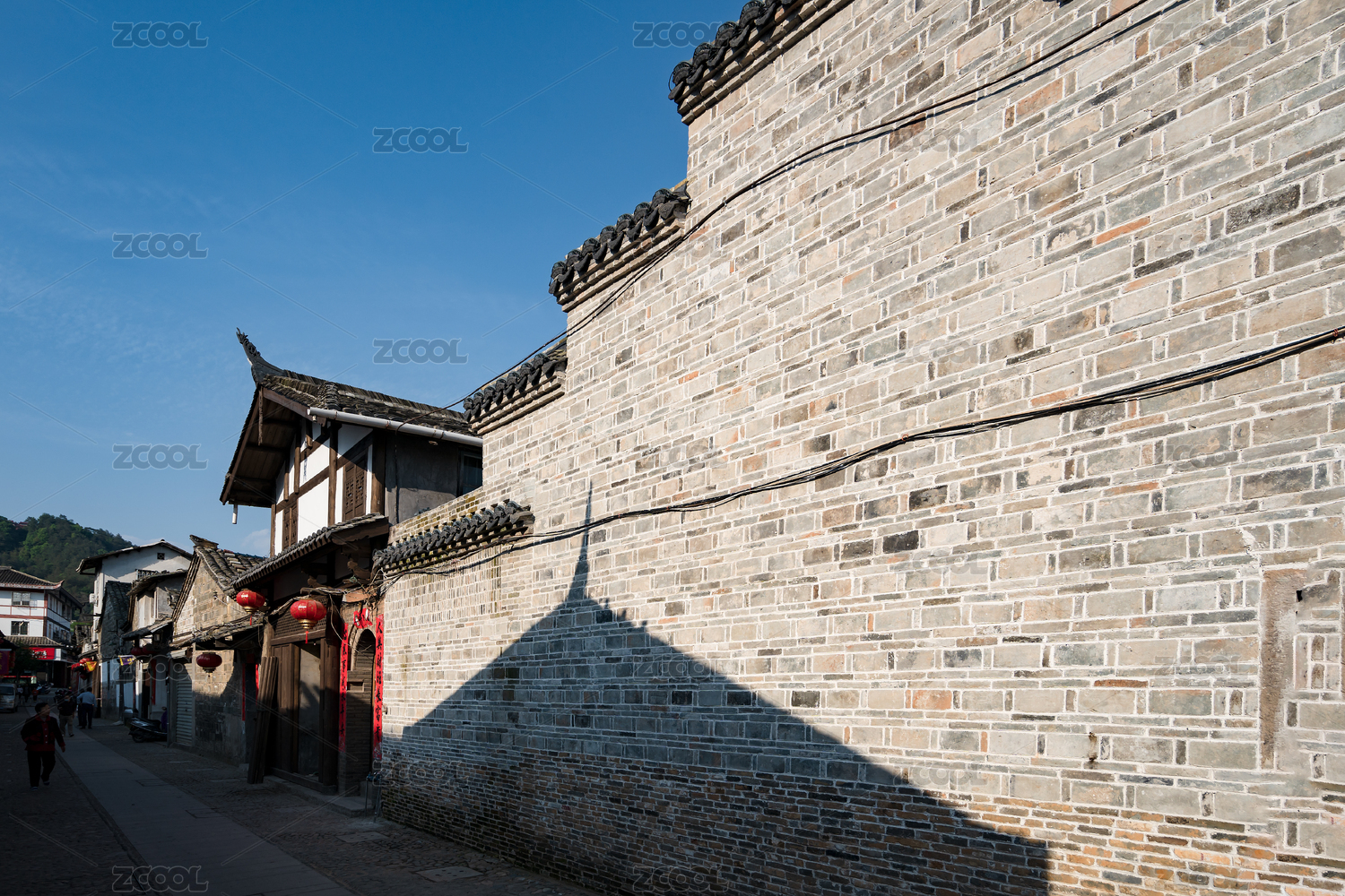 阳光把屋脊影子投射到青砖的骑马墙墙面上