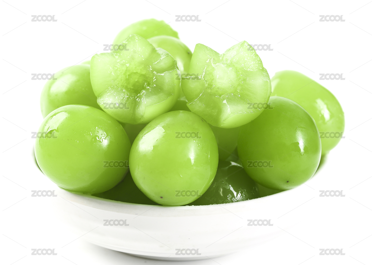 白底上放着一堆新鲜青提葡萄和青提果肉