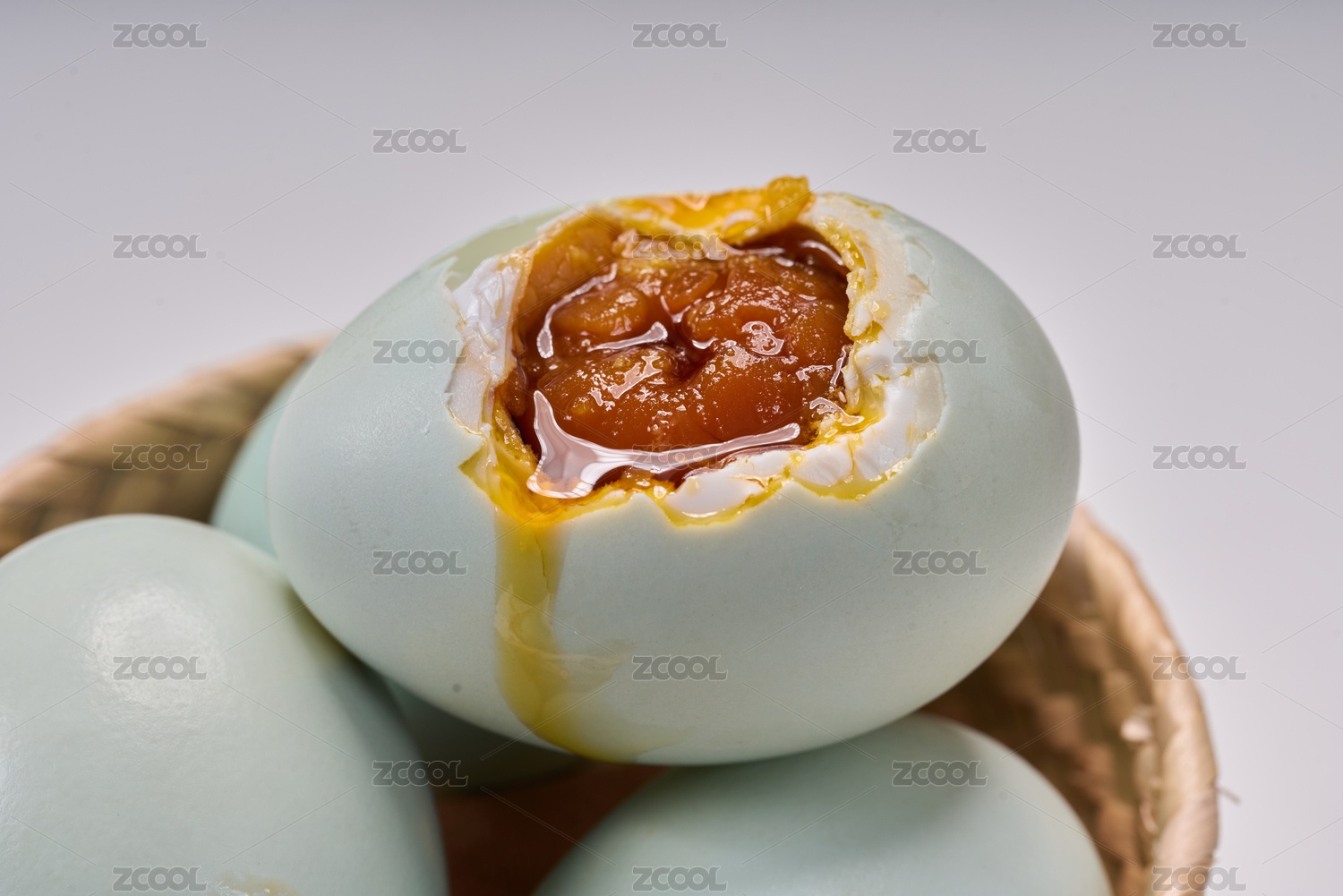 木底上放着一个完整的咸鸭蛋和一个磕开咸蛋