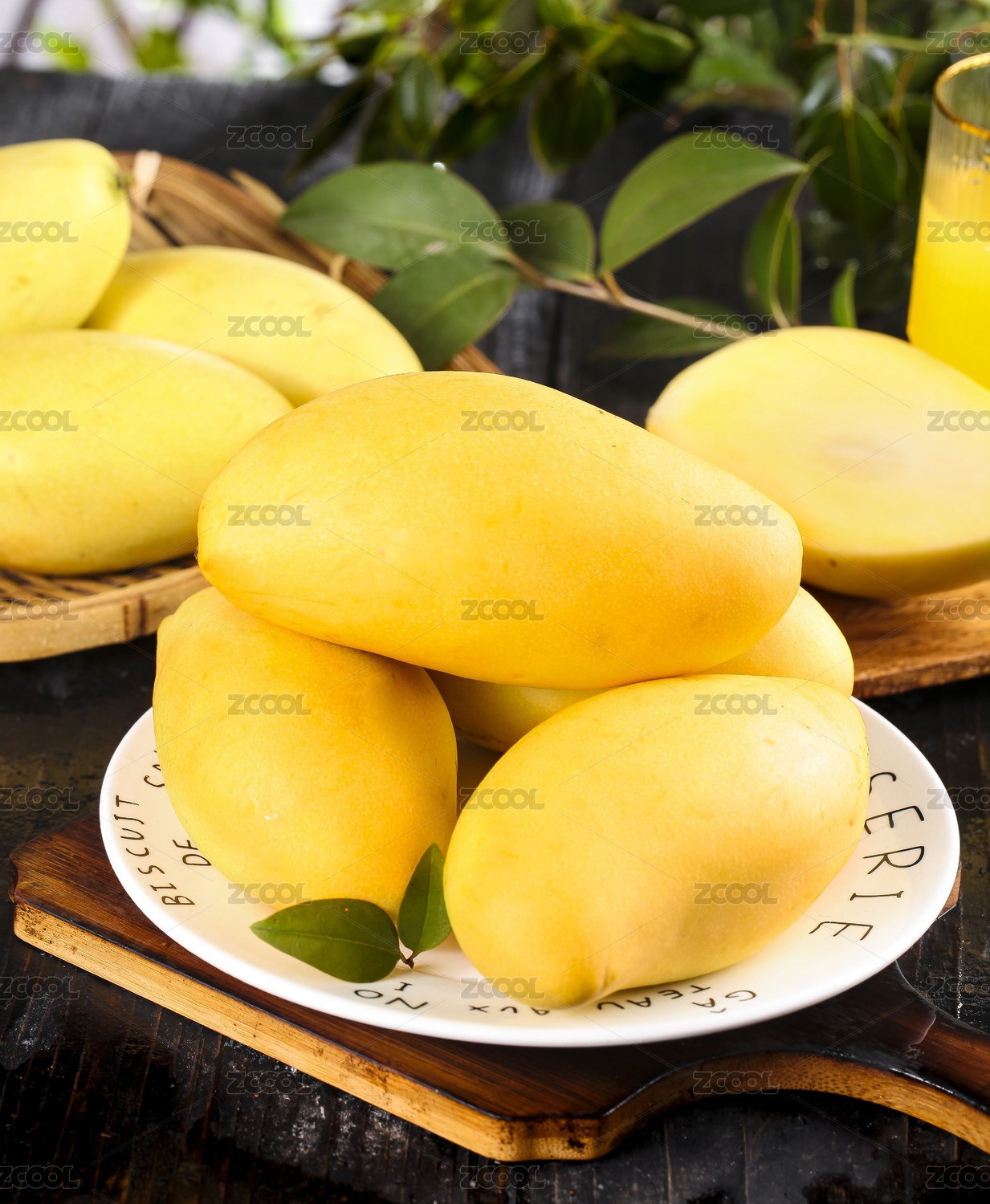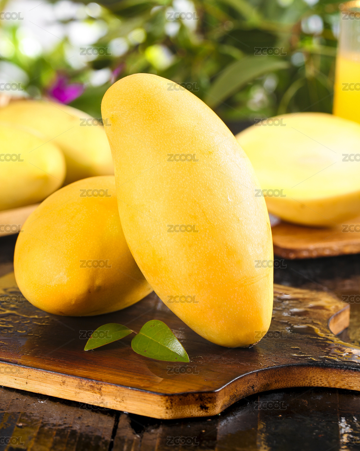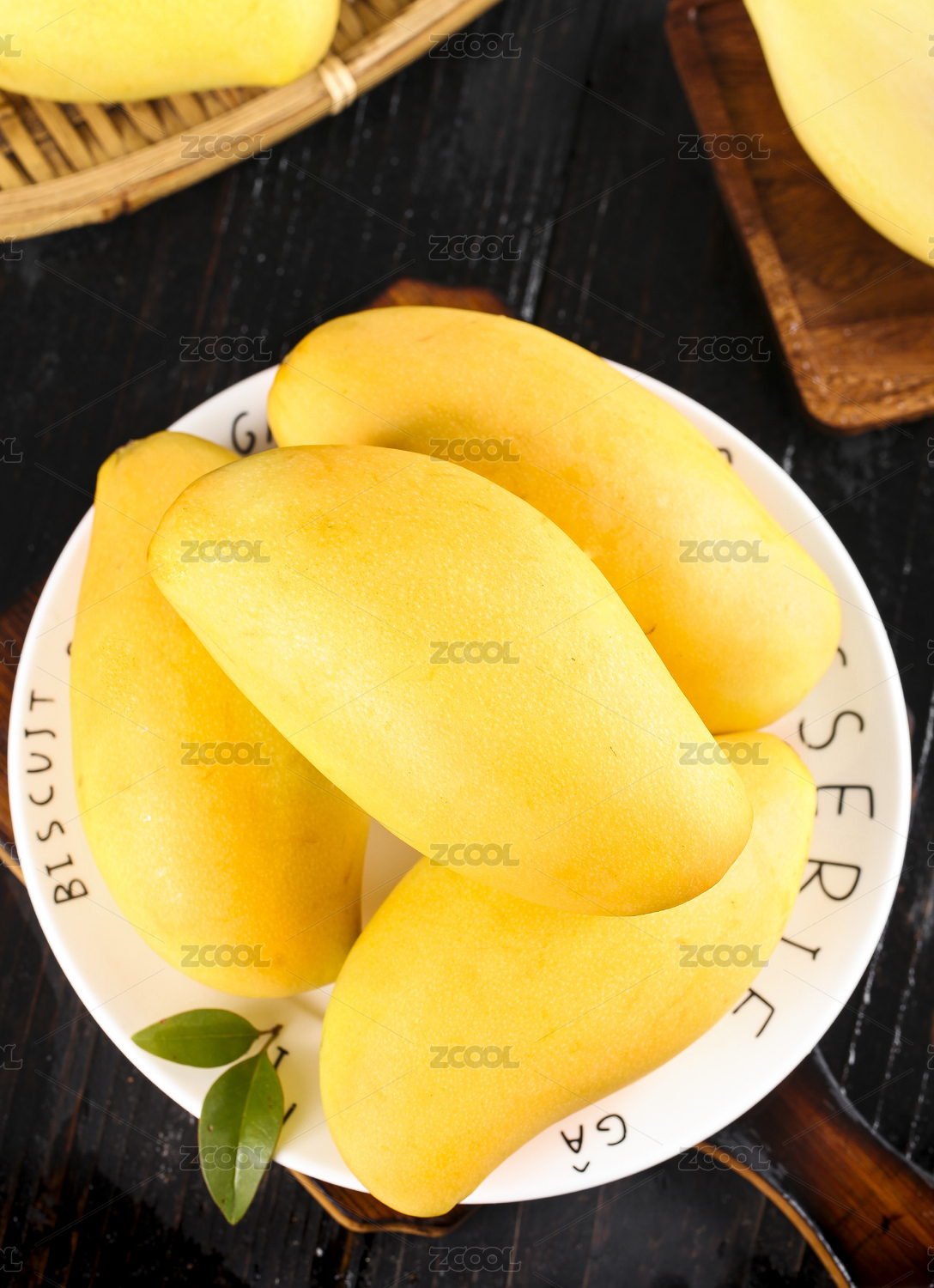 木板上放着一盘新鲜高乐蜜芒果