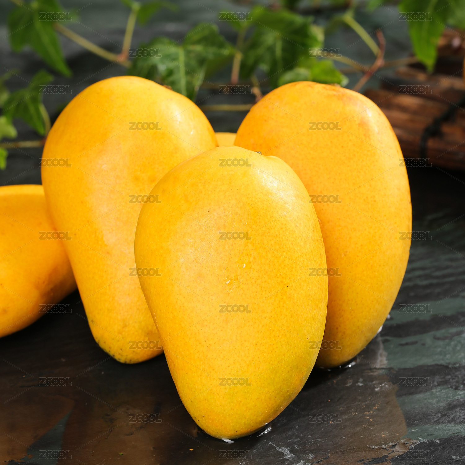 黑石板上放着钻石芒果和半边切面的芒果