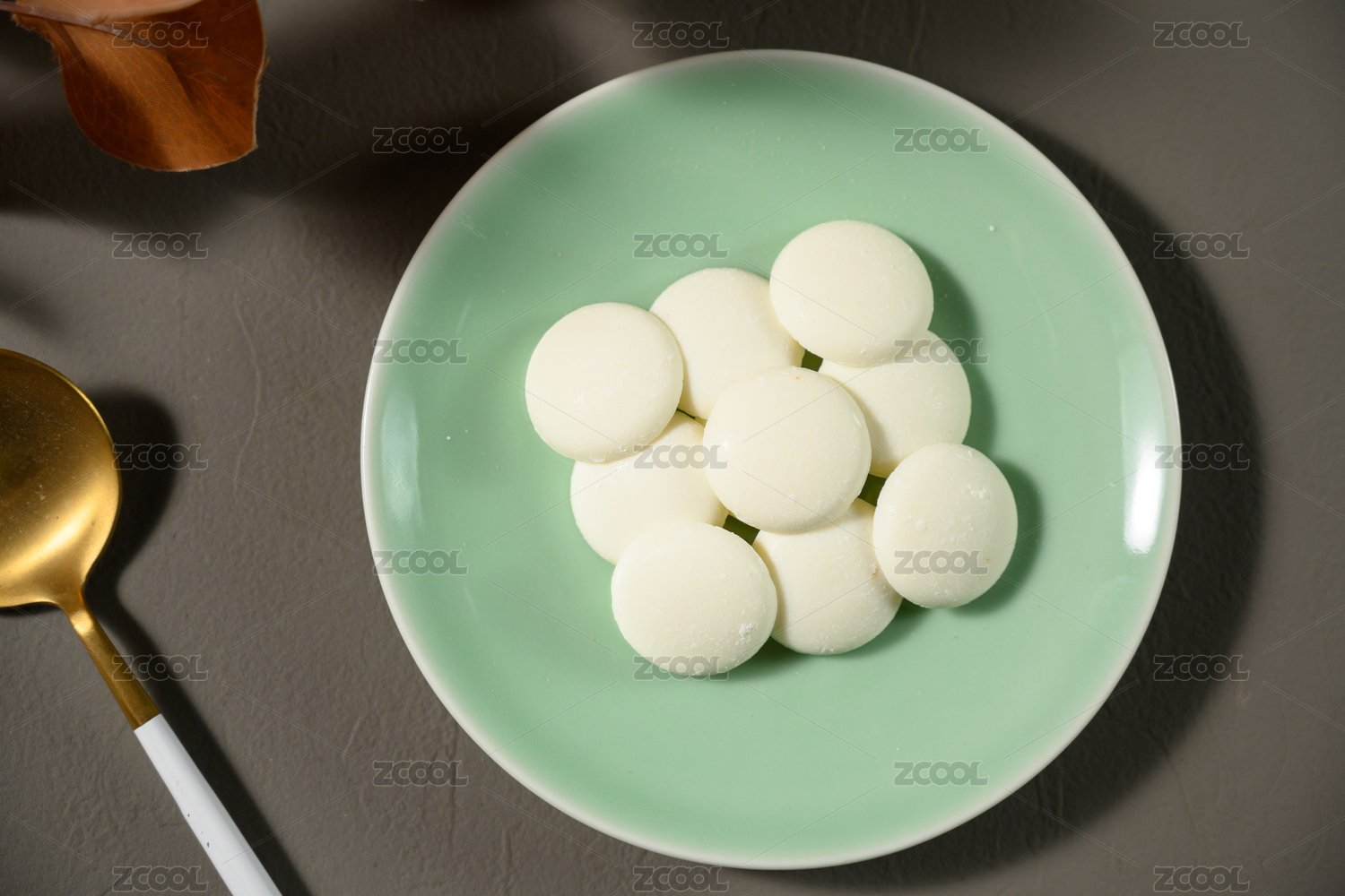 桌面上的盘子里的美味可口的白巧克力币