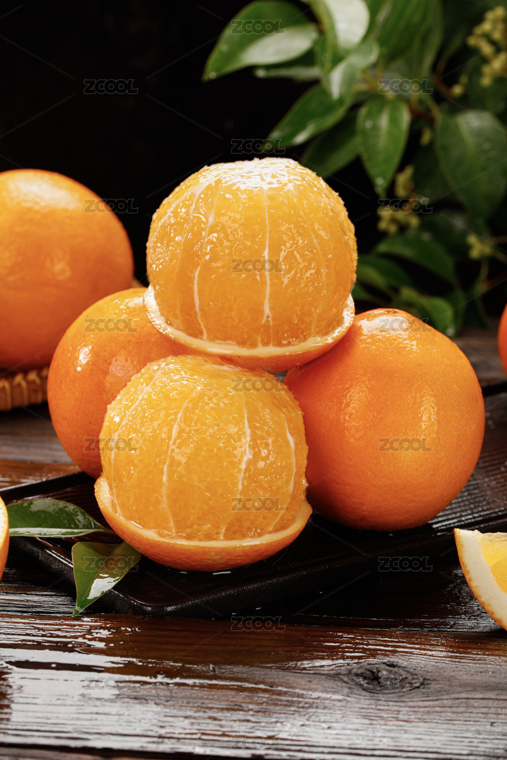 黑石板上放着一堆新鲜芦柑和芦柑果肉