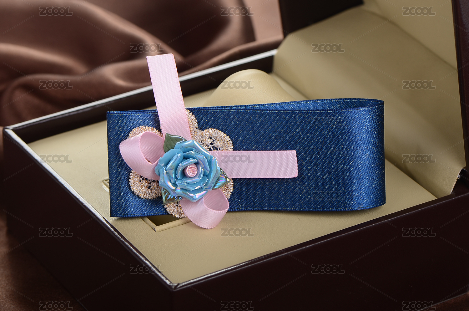 摆放在皮质首饰盒子里的一个蓝色布艺发夹