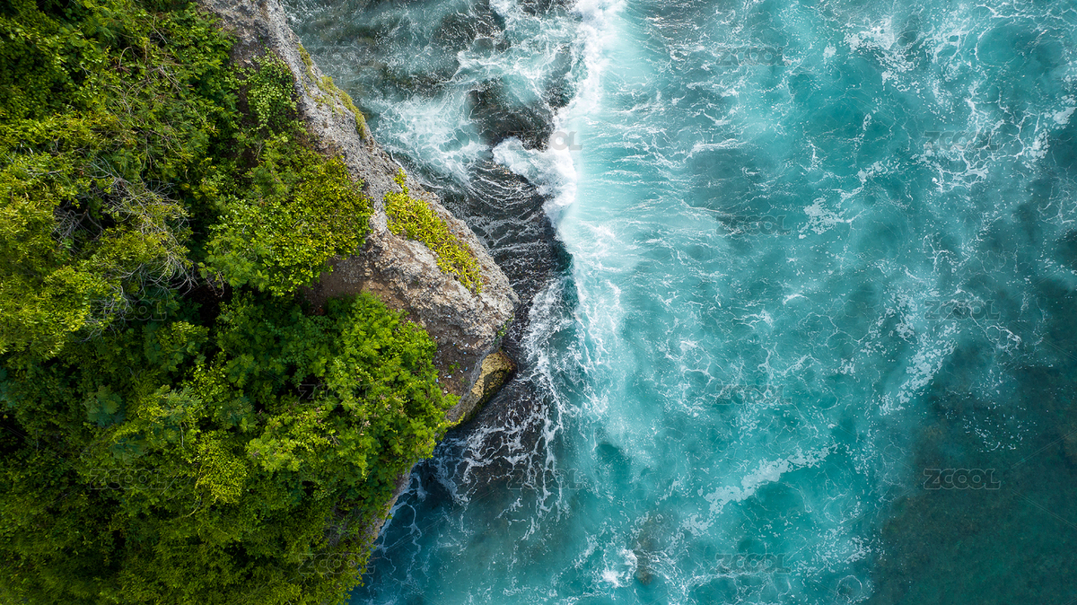 印尼巴厘岛热带雨林悬崖下的绿松石海水波浪