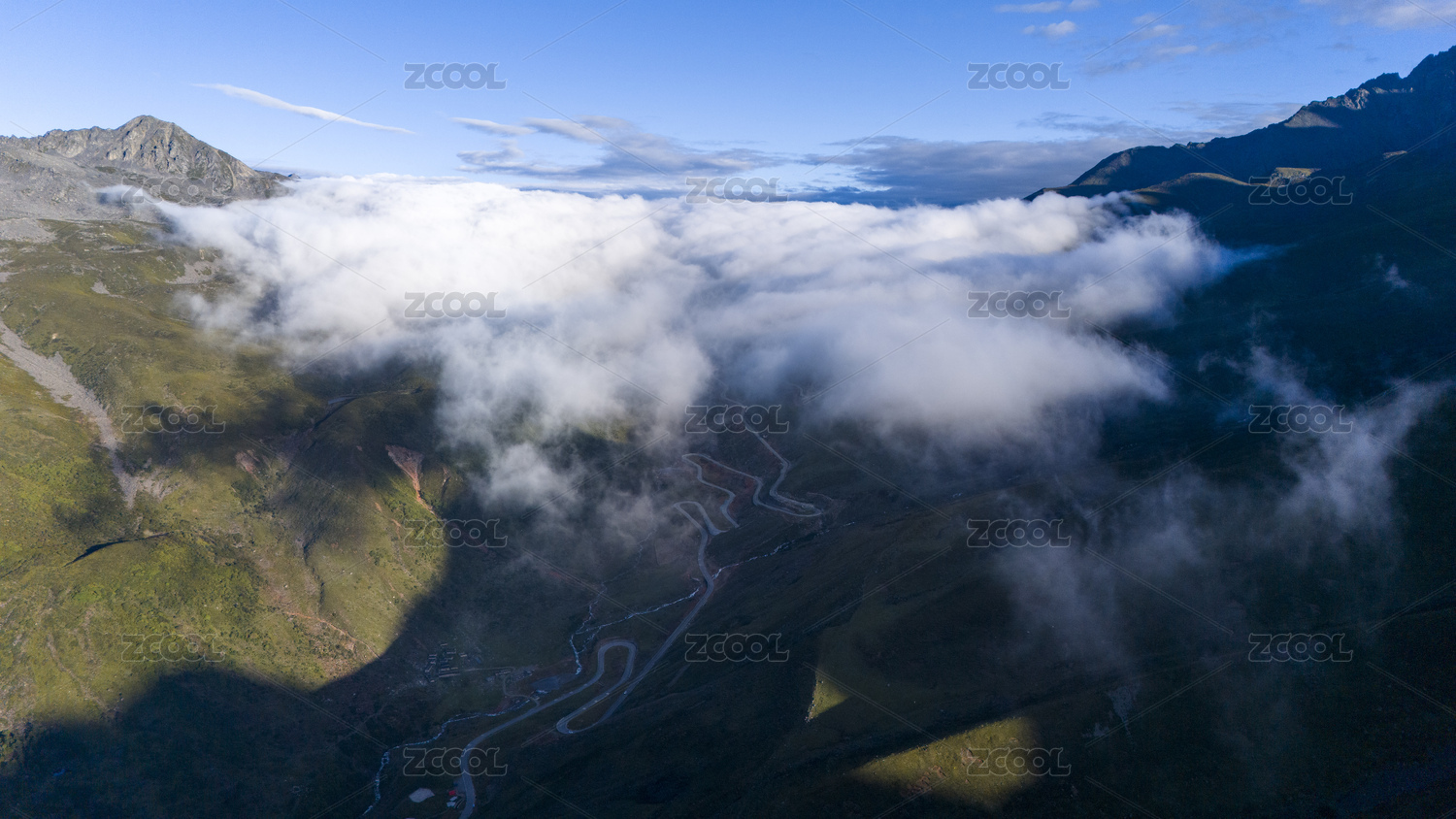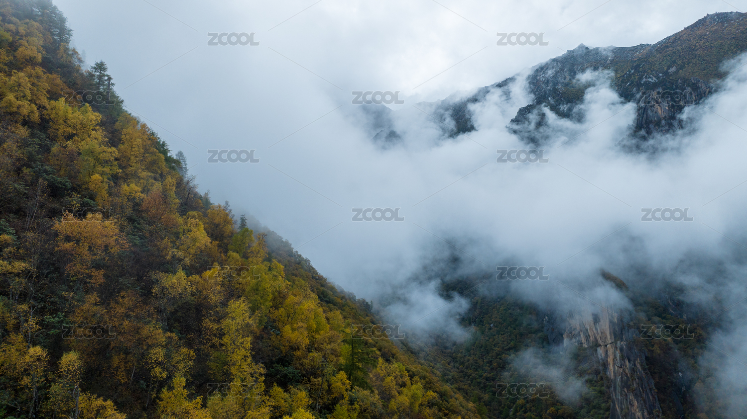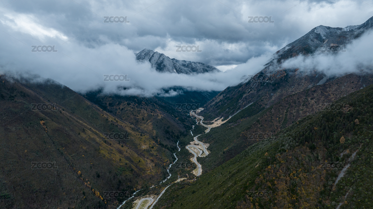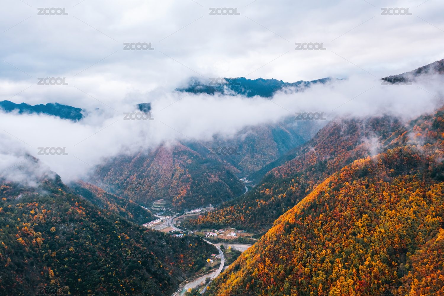 航拍云雾缭绕的中国四川甘孜秋季自然风光