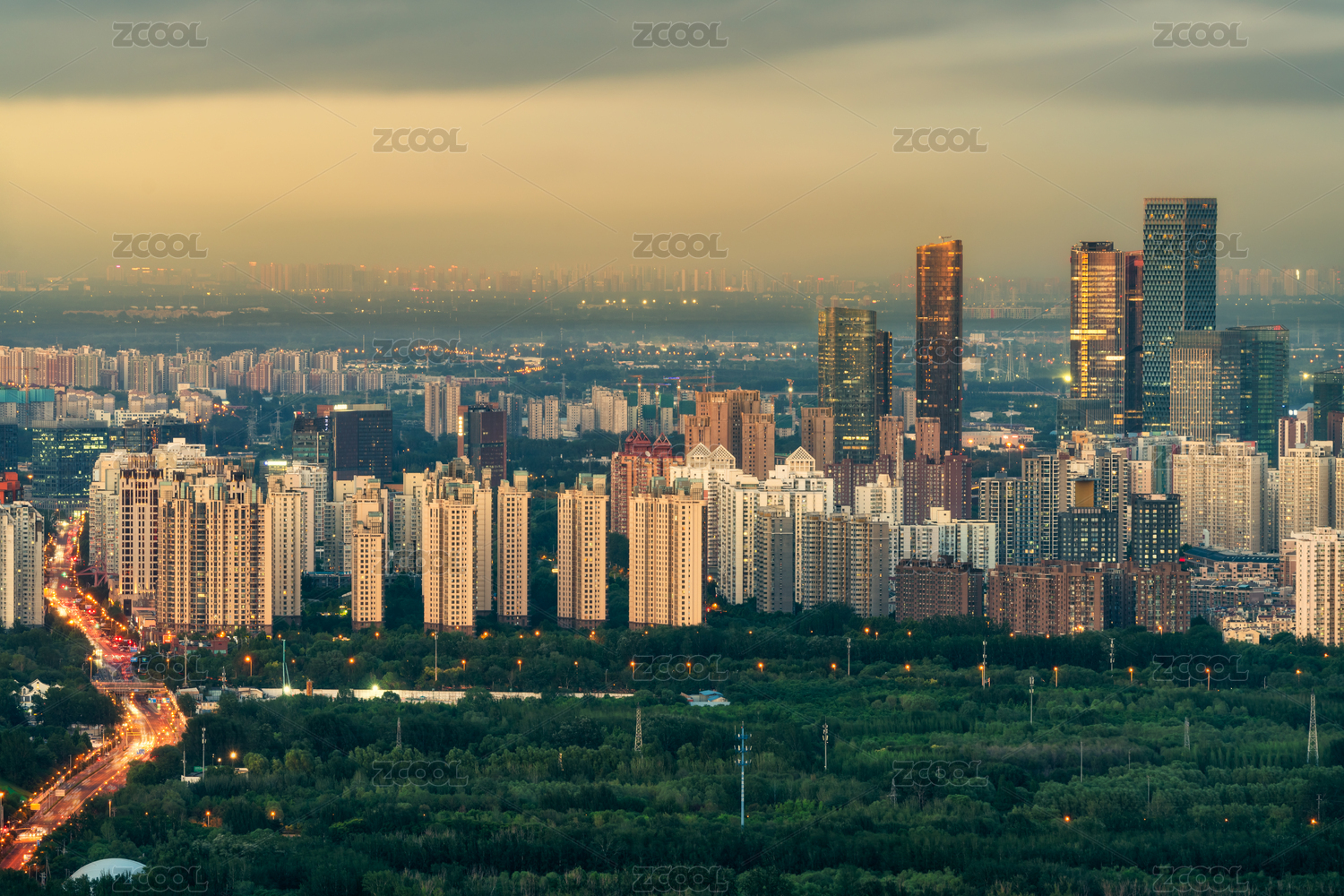 俯瞰黄昏金光中的北京繁华城市密集建筑群
