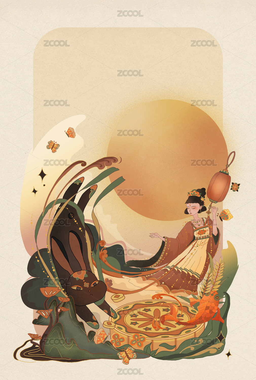 肌理插画,国风,传统节日,中秋节,包装,山水,兔子,喜庆,庆祝,节日