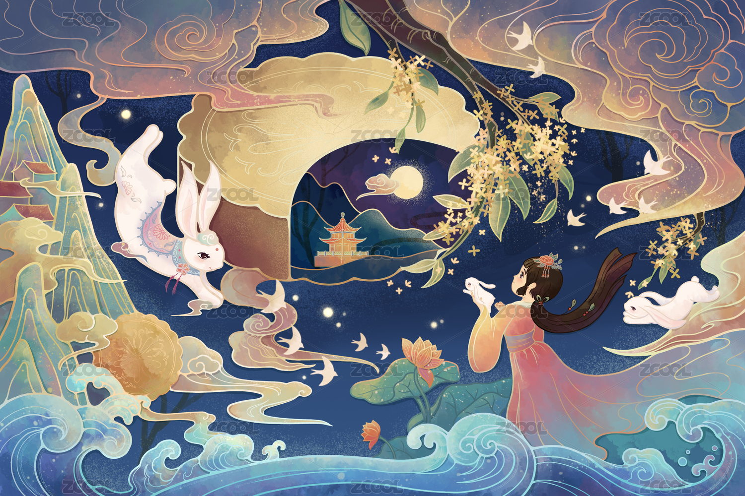 中秋节传统节日嫦娥奔月神话传说国潮插画