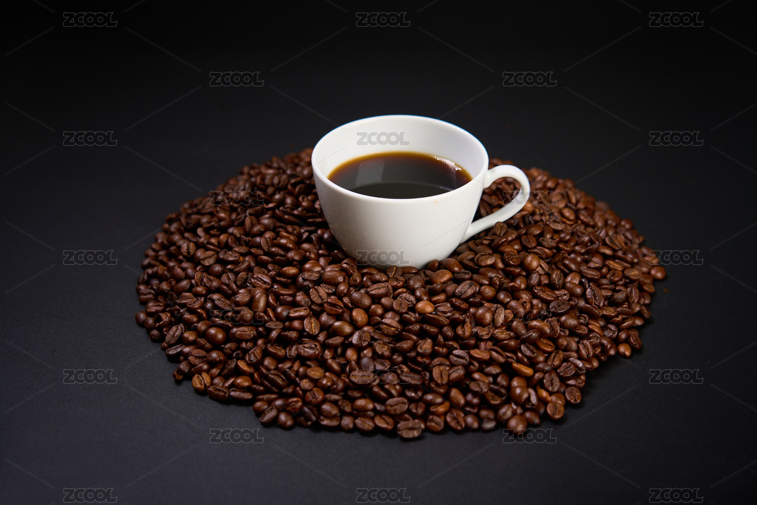 一堆阿拉比卡咖啡豆中间有着一杯咖啡