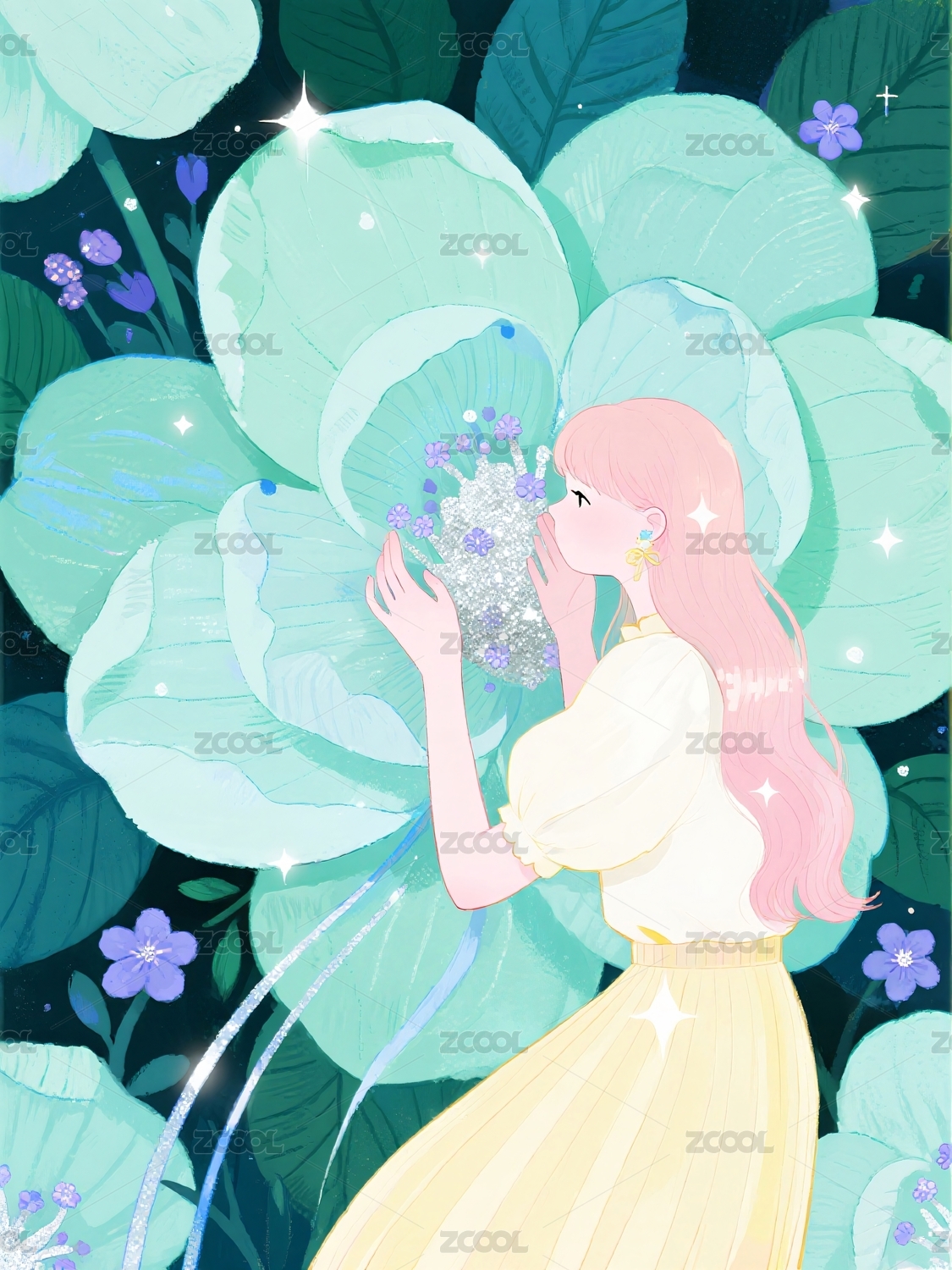 身穿长满鲜花的长裙的女孩回眸节气插画