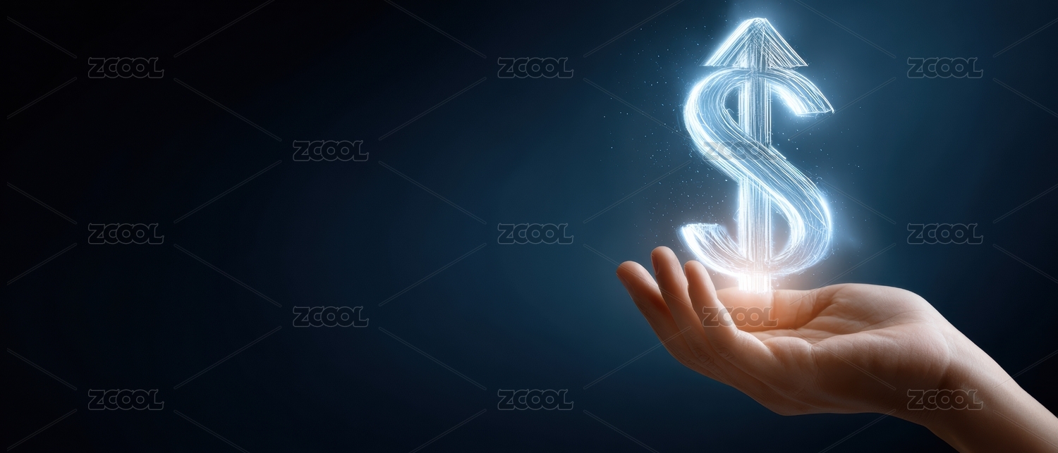 一个商务人士手指着金钱美元符号虚拟数字货币区块链投资理财概念