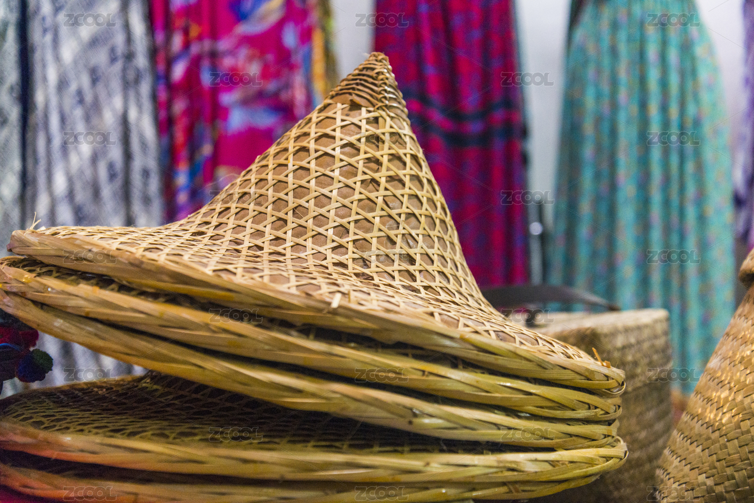 泰国甲米的兰塔岛古镇市场摊贩卖的竹编帽子