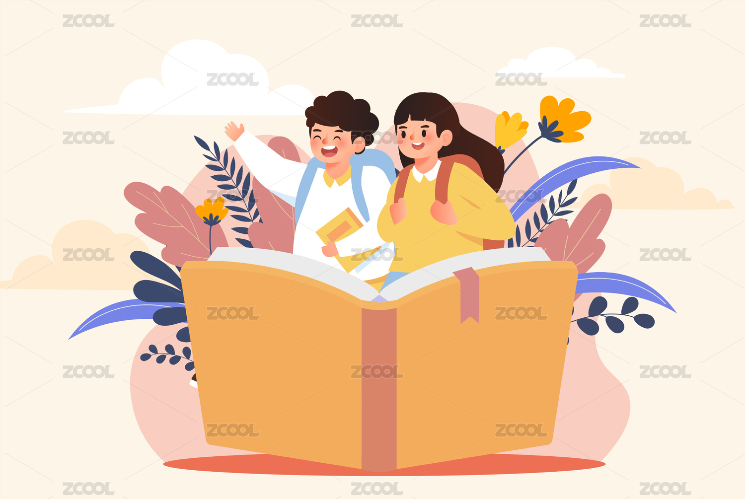 孩子们开心阅读场景插画