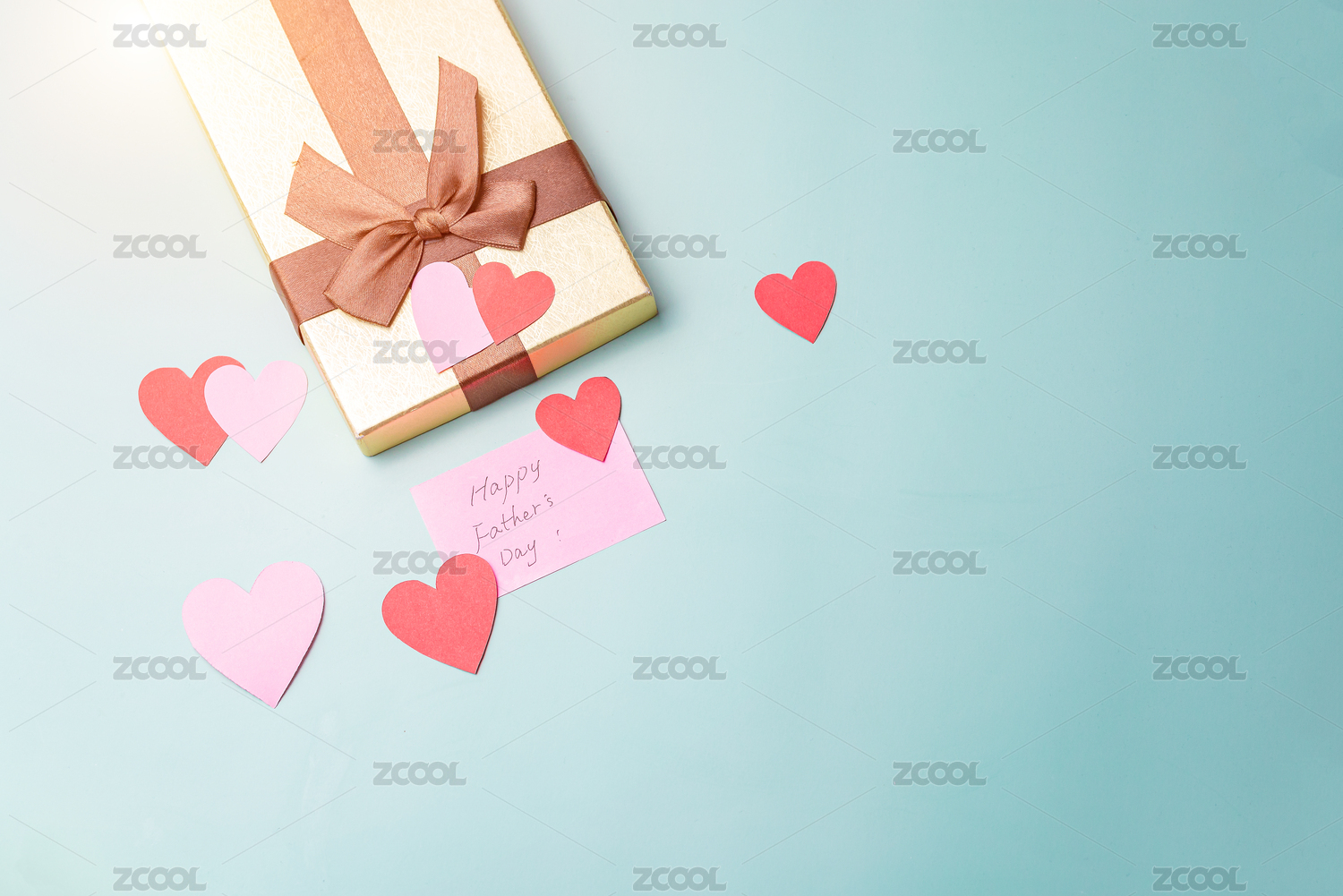 桌面上的礼物盒、爱心及写有祝福语的小纸条