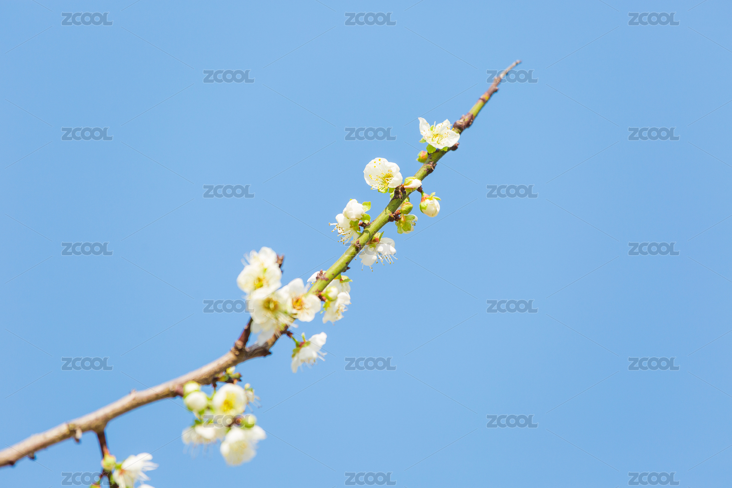 蓝天背景下生长在枝头的白色梅花
