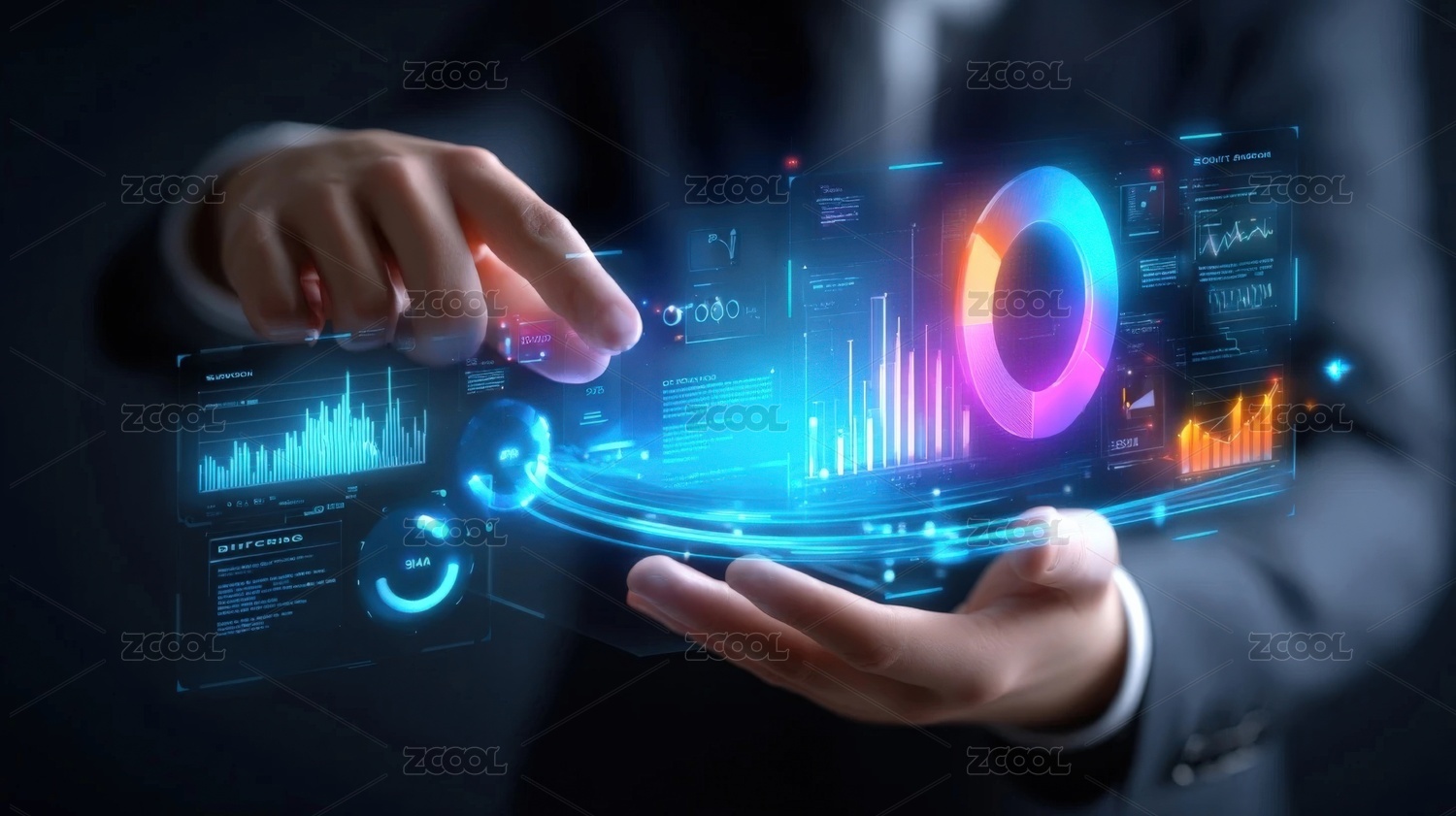 数据分析人员触控虚拟全息投影屏幕进行全球化金融数据智能分析解析