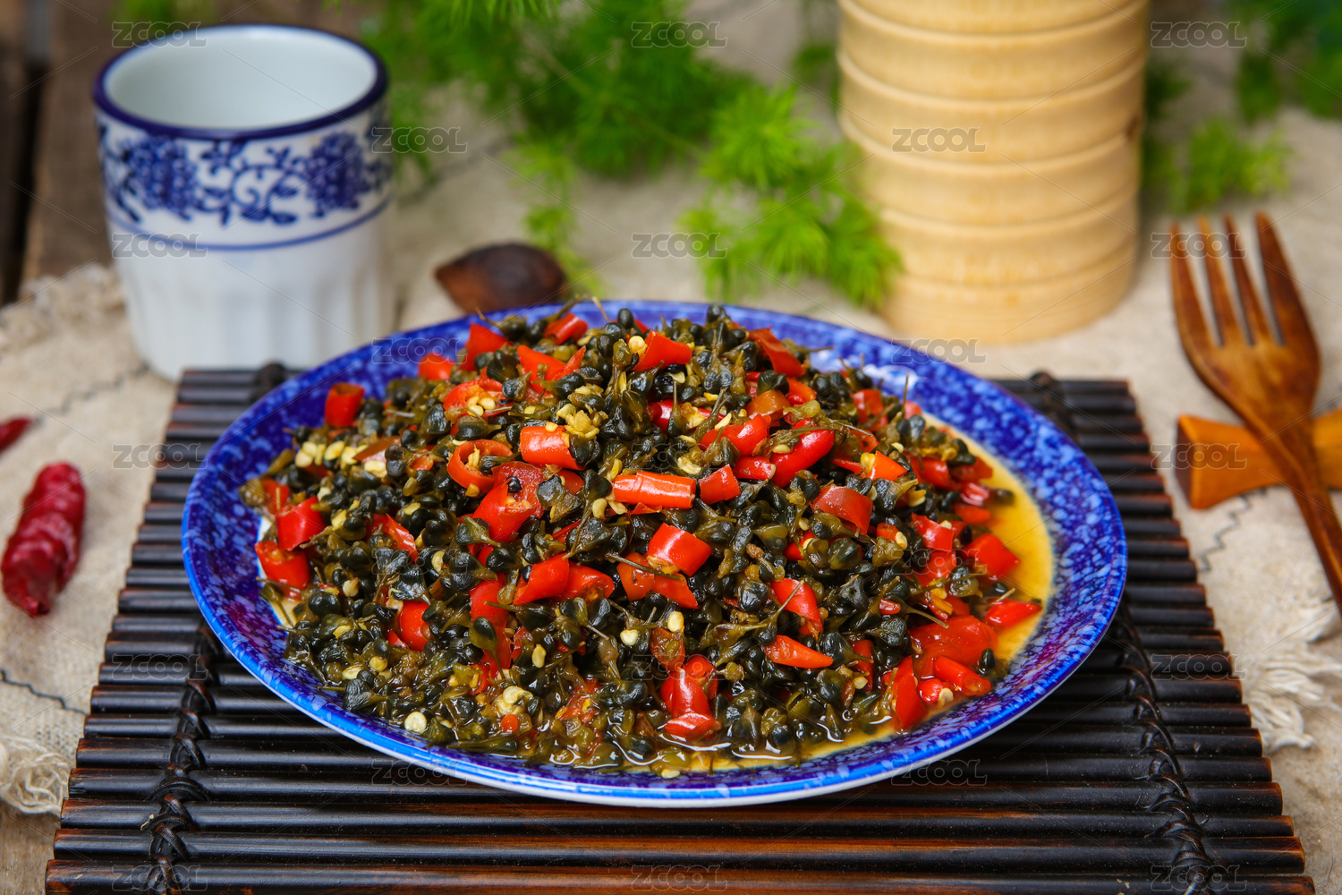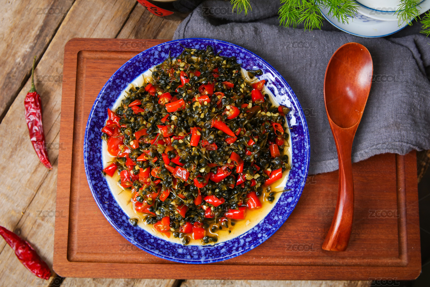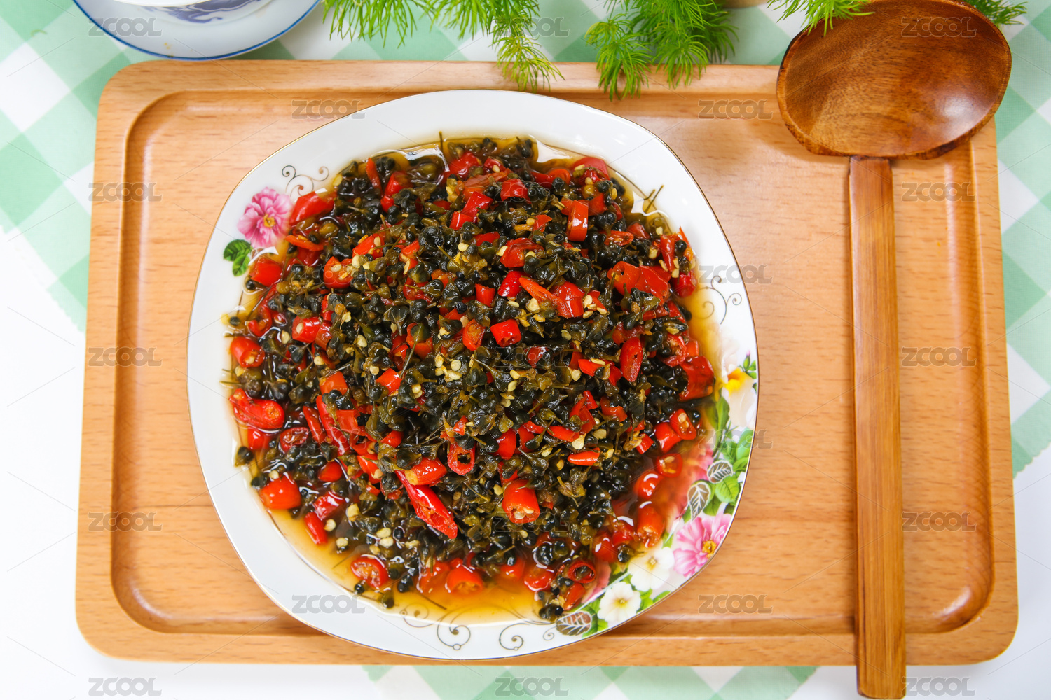 木桌背景一盘湘菜外婆菜炒鸡蛋