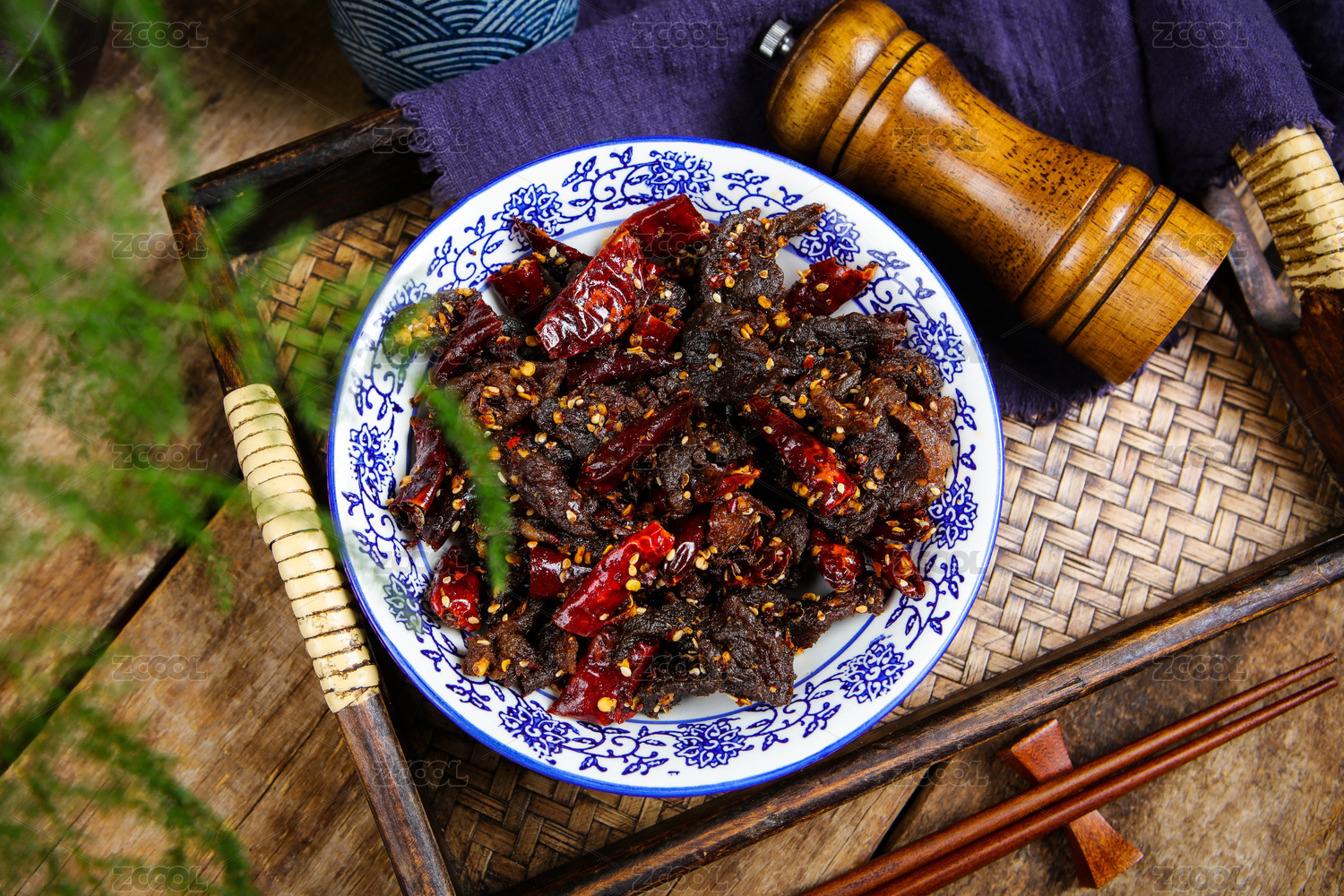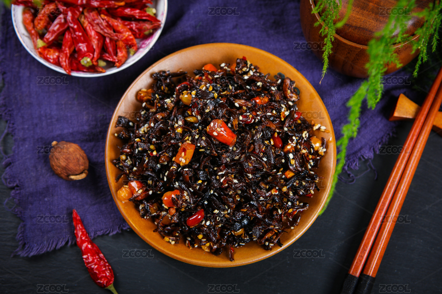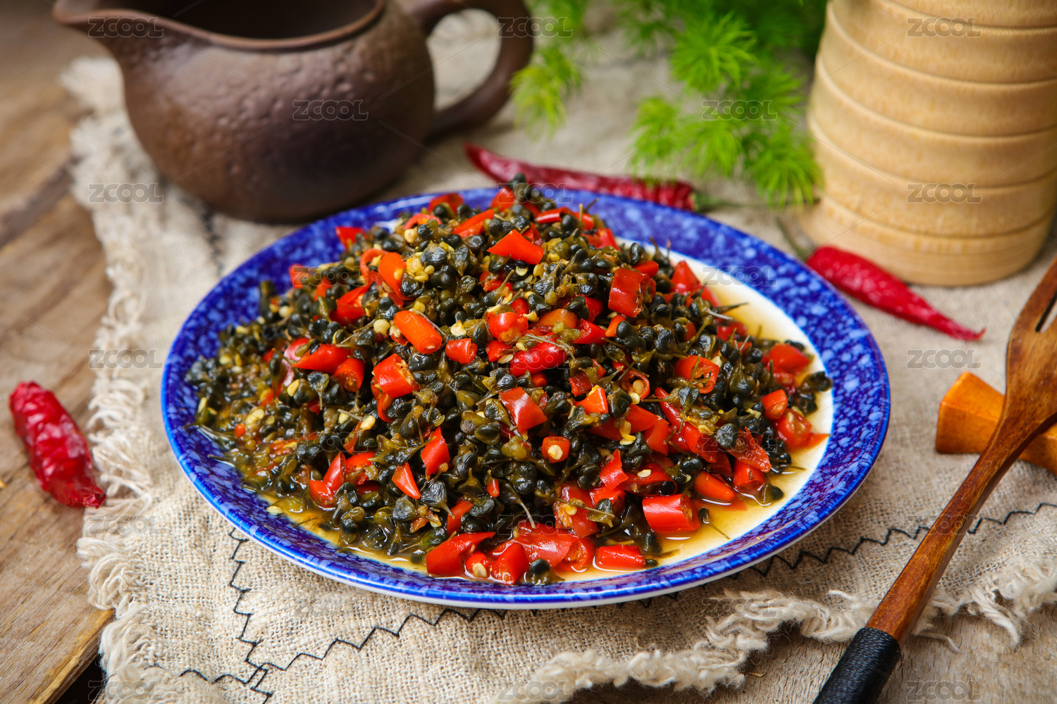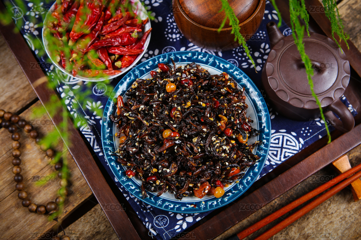 木桌背景一盘湘菜外婆菜炒鸡蛋