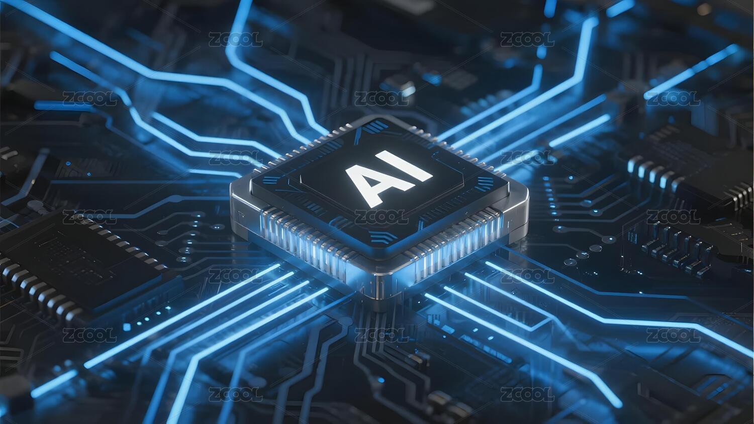 深蓝色背景下AI芯片与电路板图案