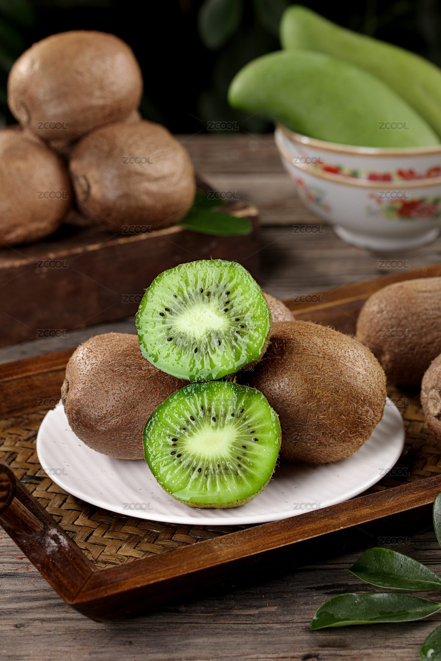 切开放在圆形木盘子上的新鲜绿心猕猴桃