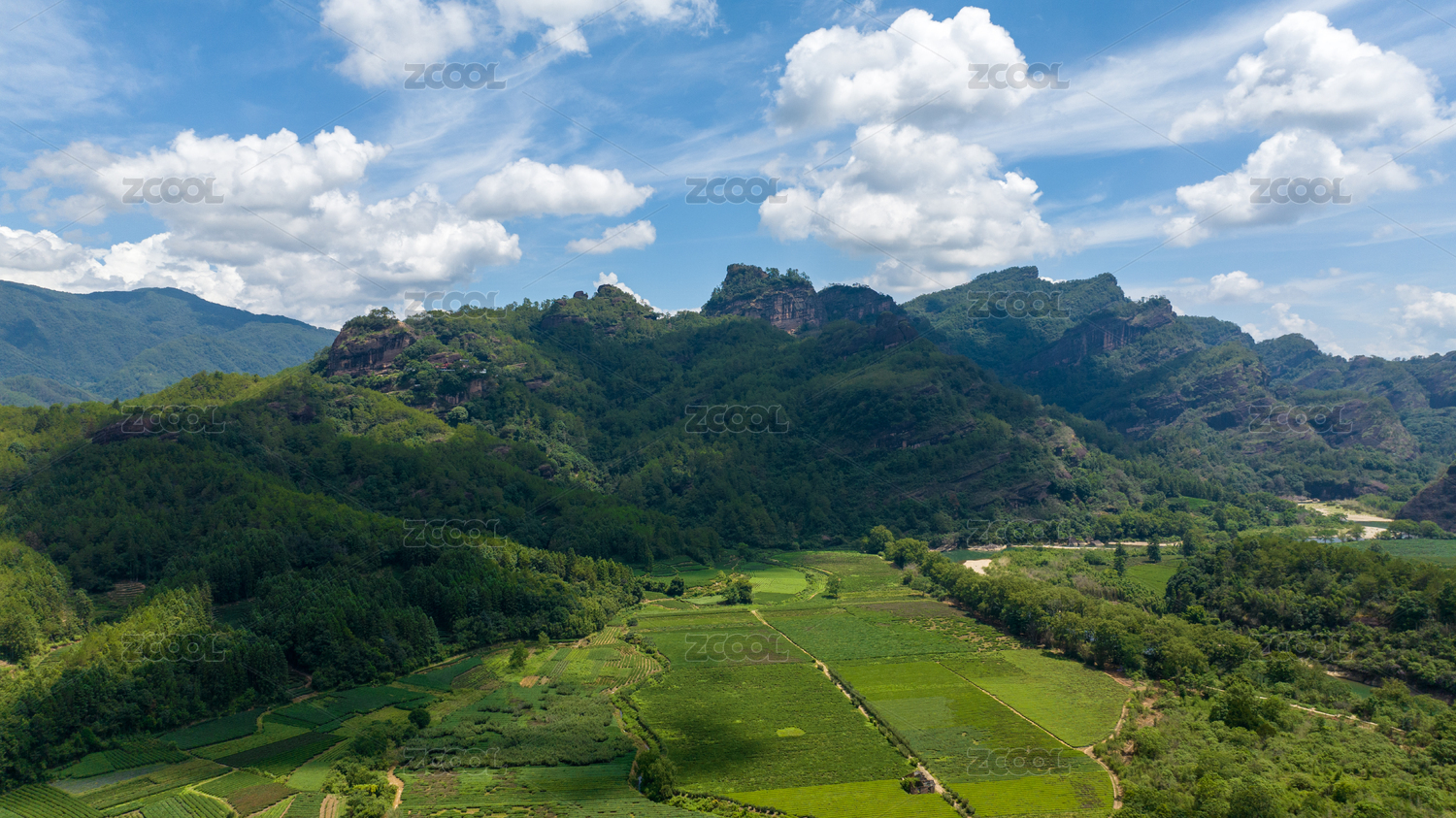航拍武夷山绿色农田与茶园