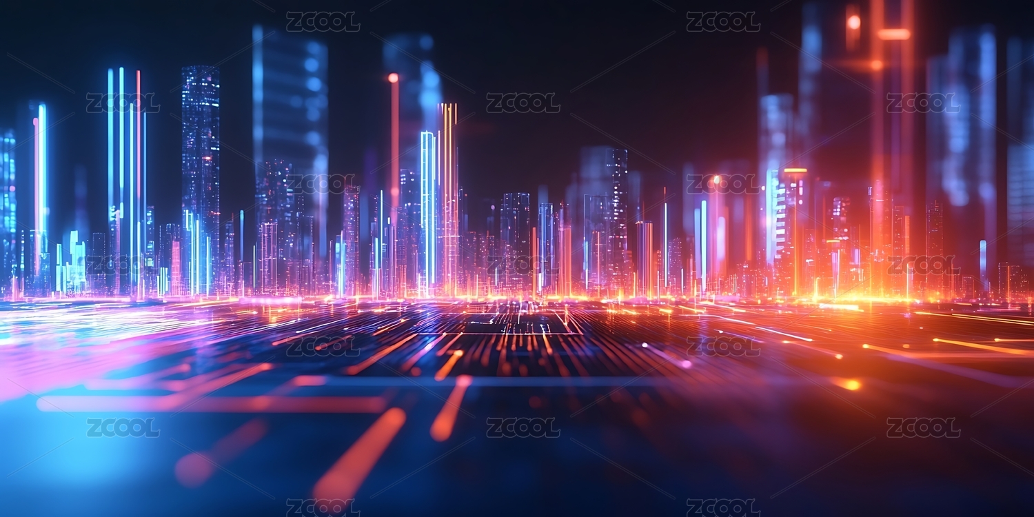 现代城市建筑蓝灯3D技术摩天大楼智能数据
