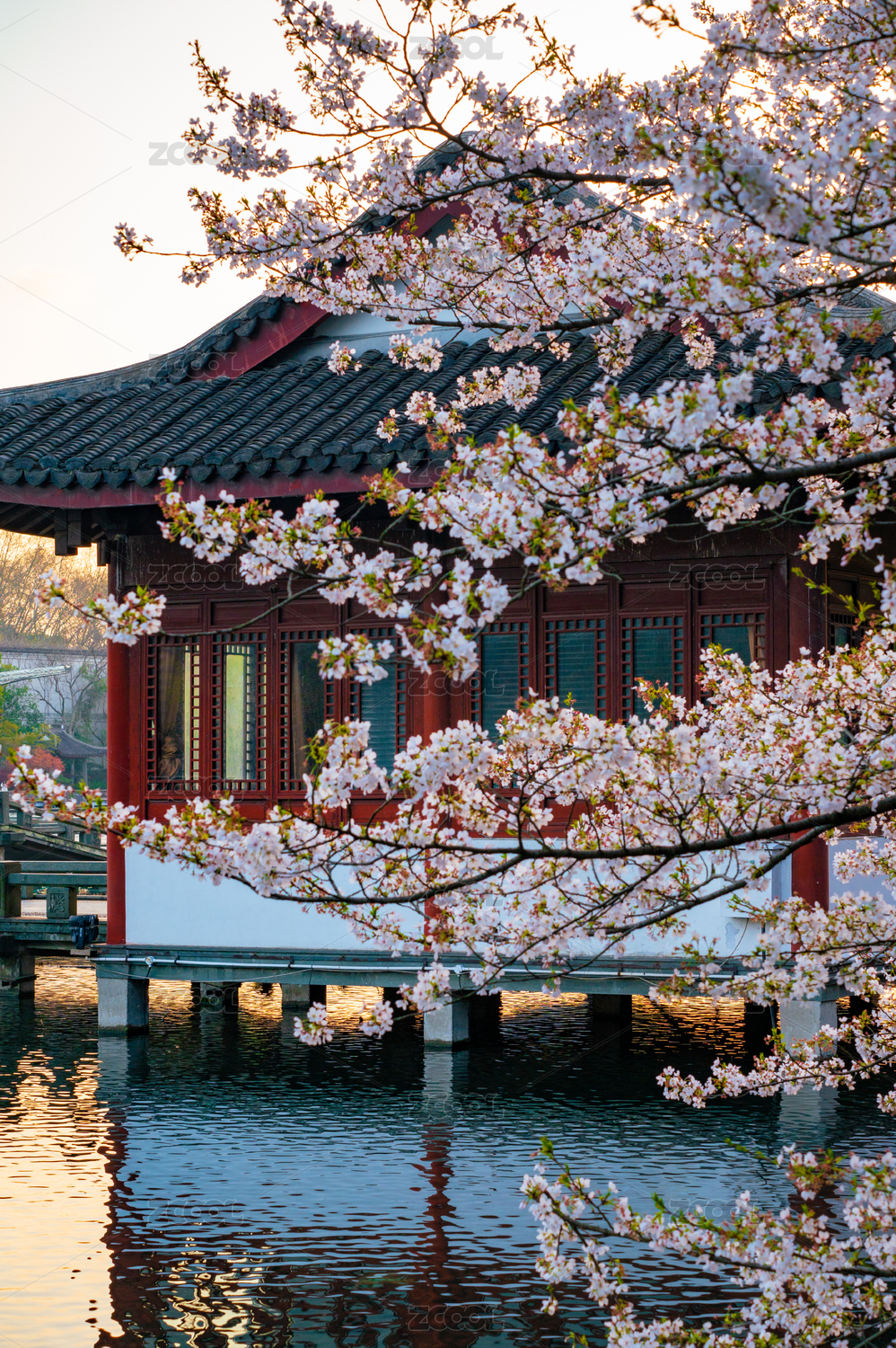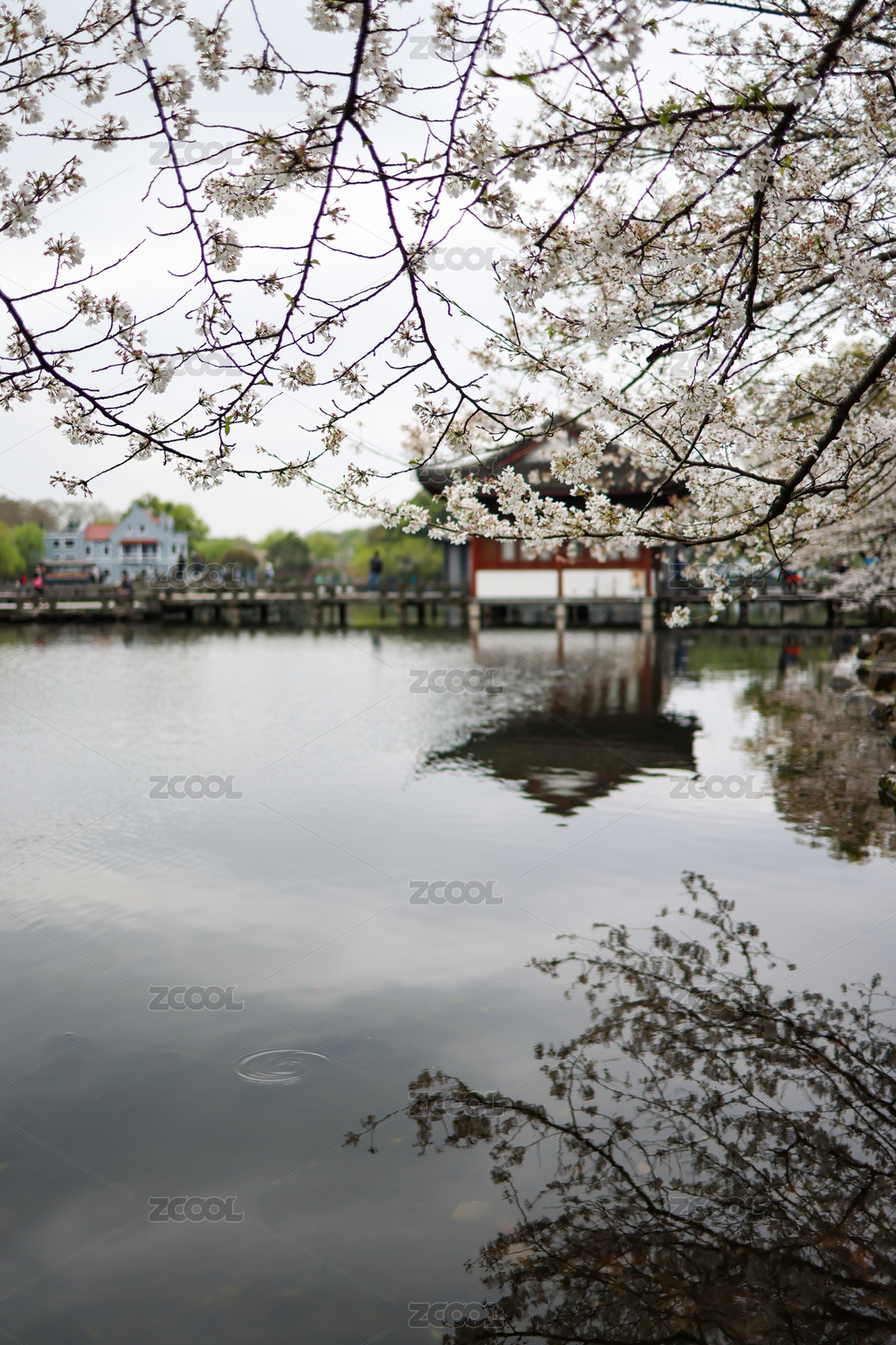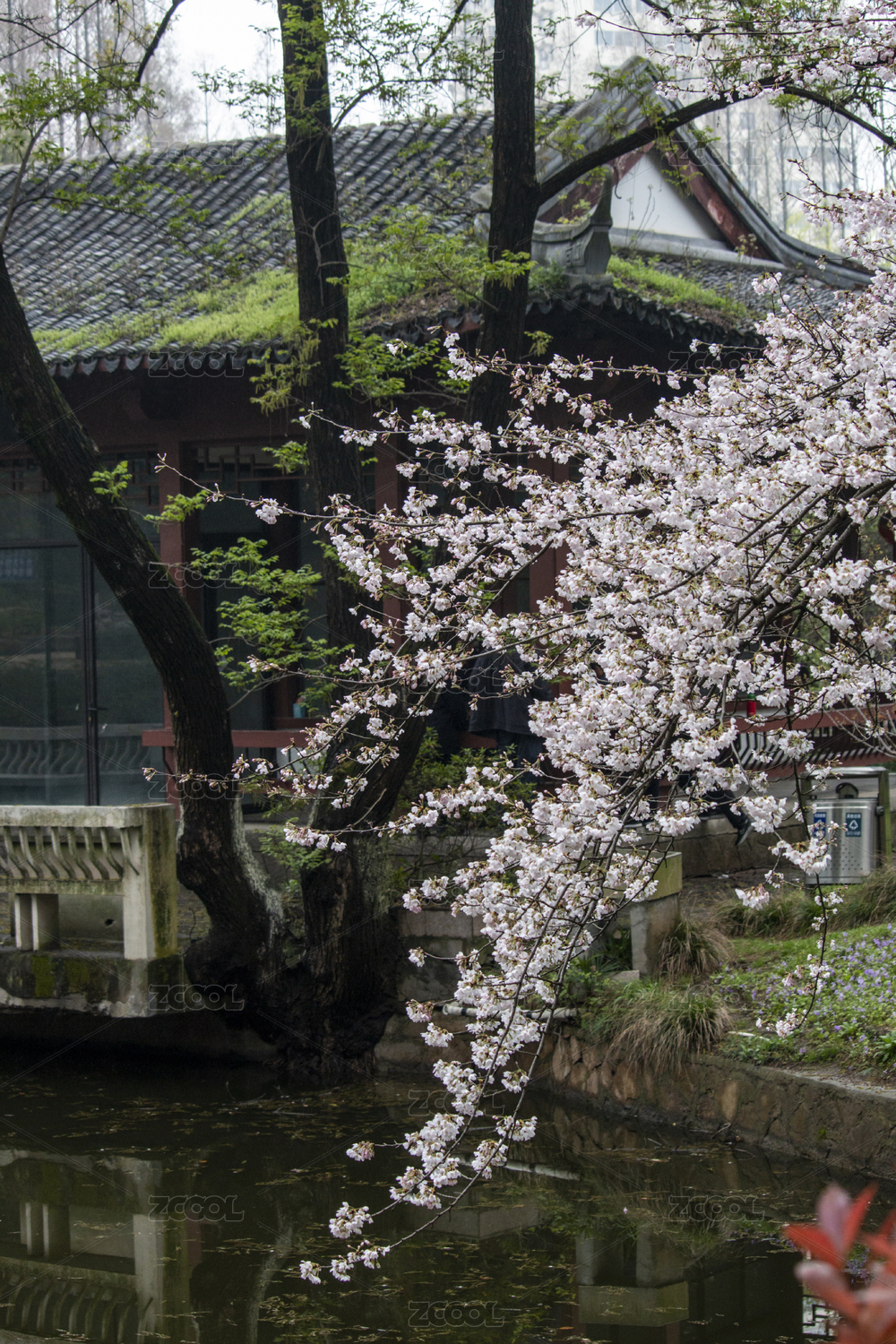 中国杭州西湖曲苑风荷芙蓉水渠樱花开了