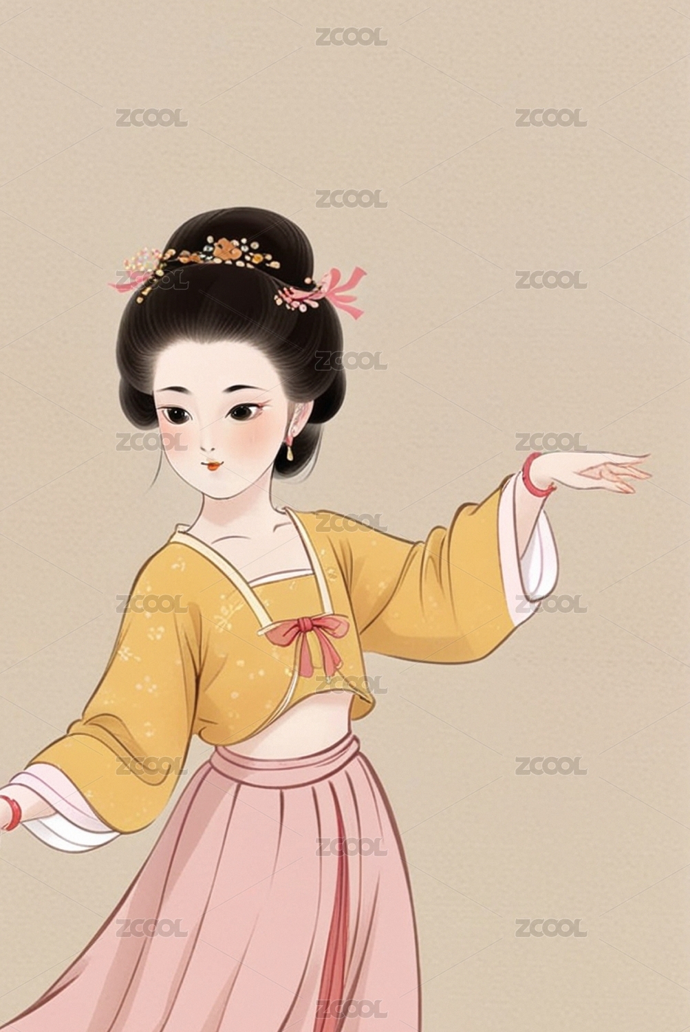 Q版可爱古代穿着汉服的唐女孩原创手绘插画