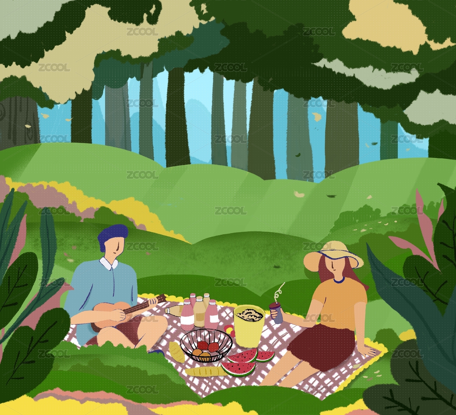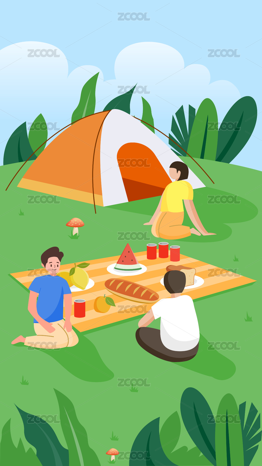 在野外吃烧烤唱歌露营野餐的人矢量插画海报