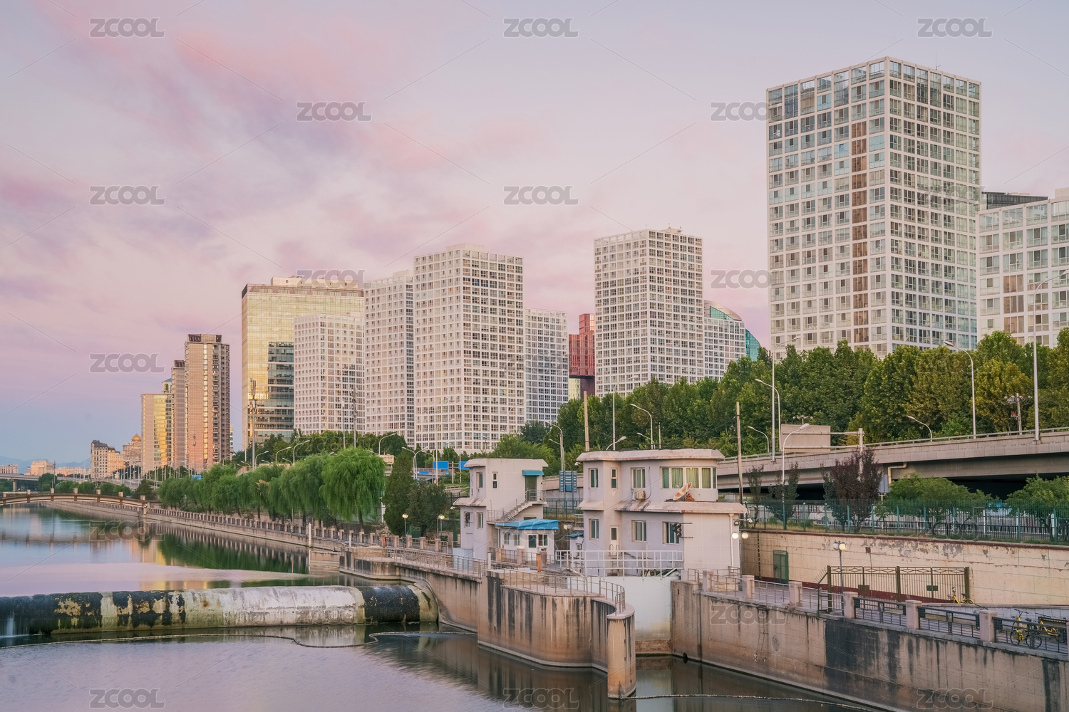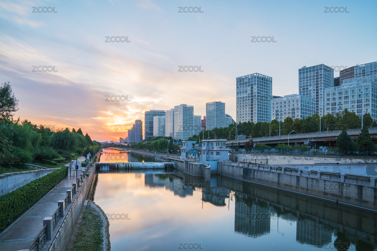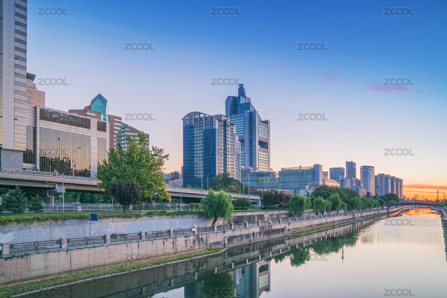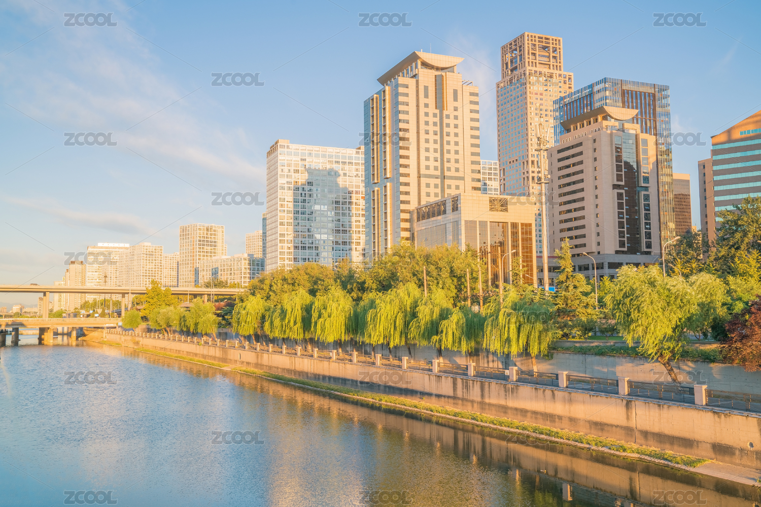 中国北京通惠河边建外CBD的现代建筑群天际线