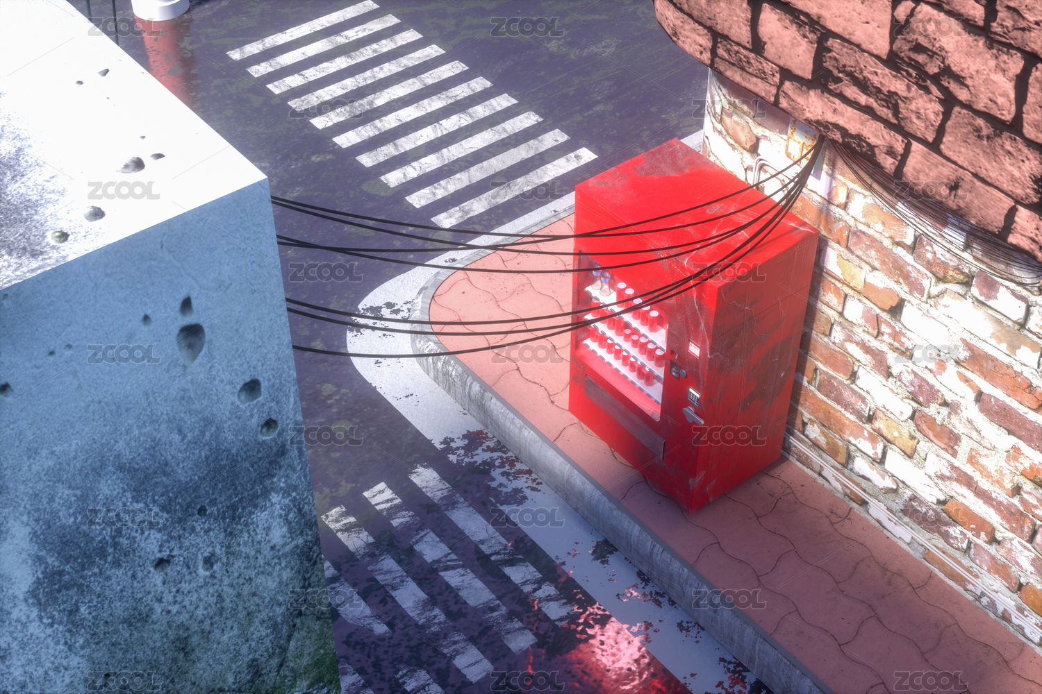 阳光下的复古风格街道边的贩卖机,三维渲染