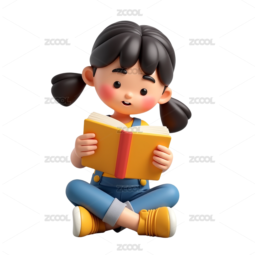 白底3D卡通风格坐在书本上微笑看书的儿童