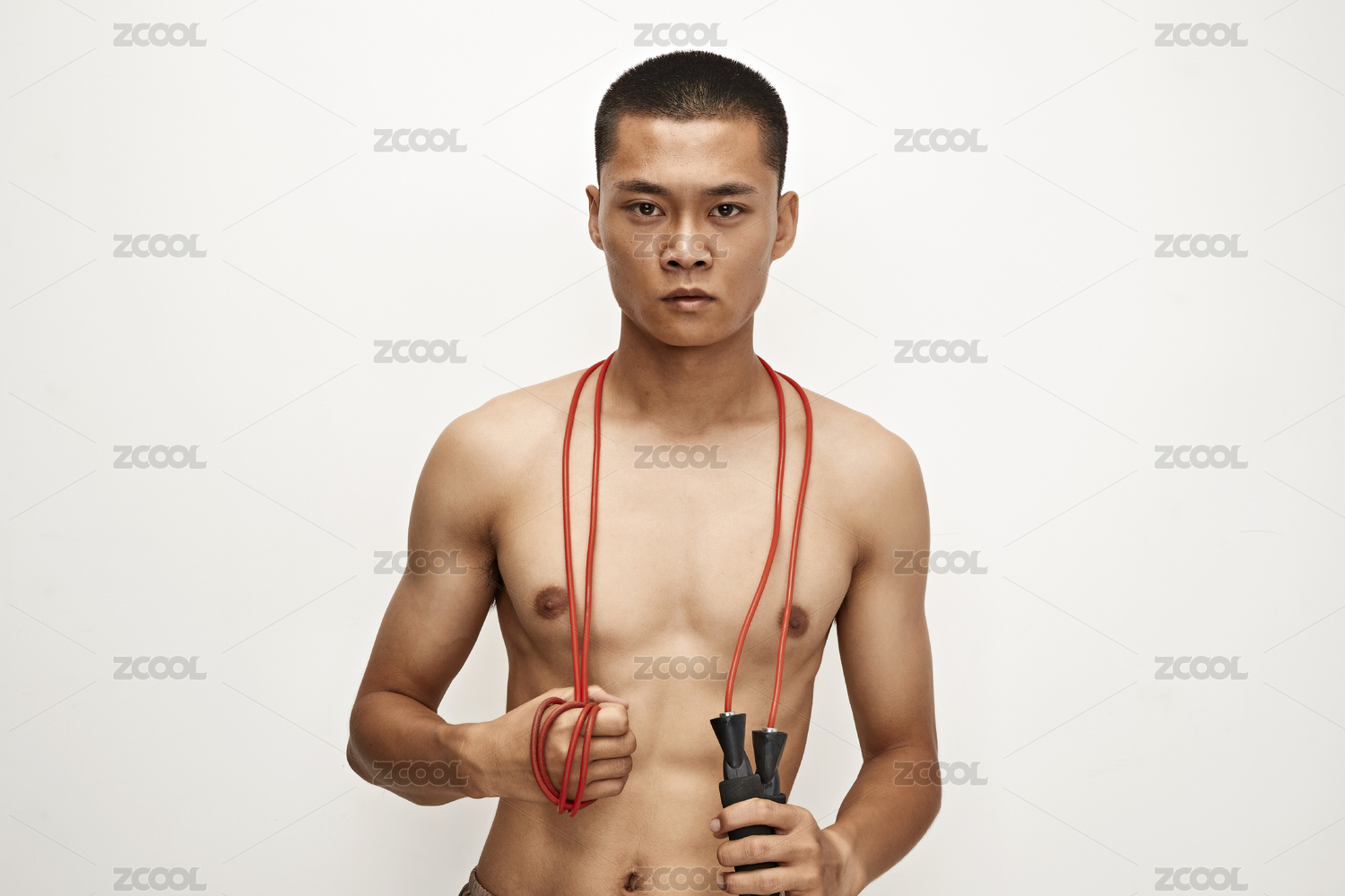 白色背景下手持运动跳绳的亚洲健身男士形象