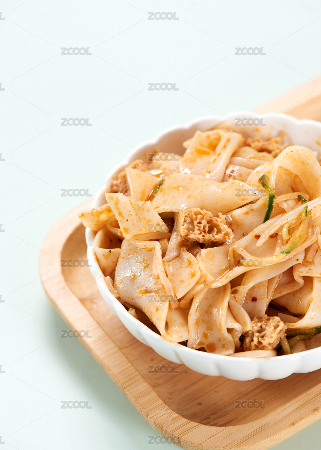 纯白色背景装在白盘子里的传统街边小吃凉拌豆皮