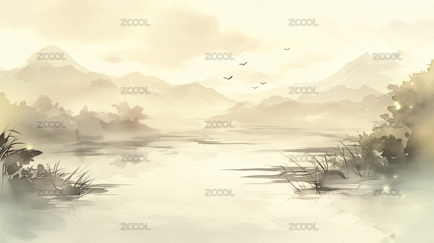 白露,节气,海报,古风,湖边,芦苇,山峦,水墨风格,极简,风景